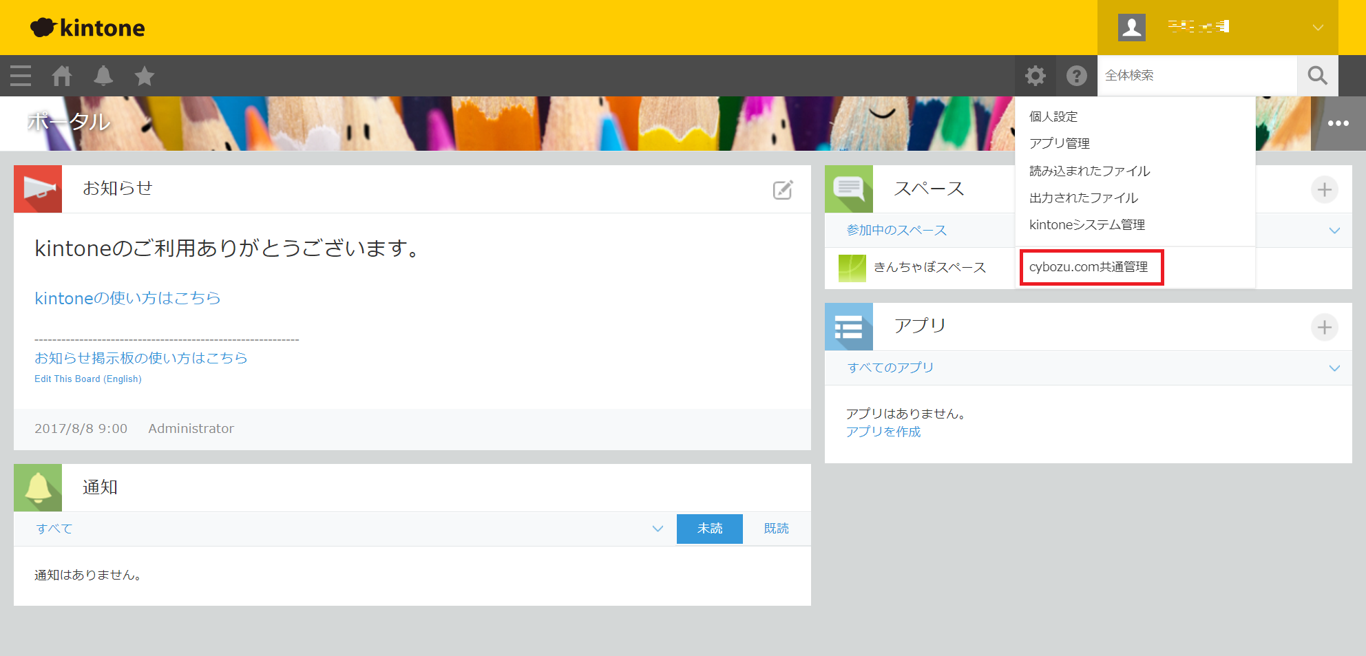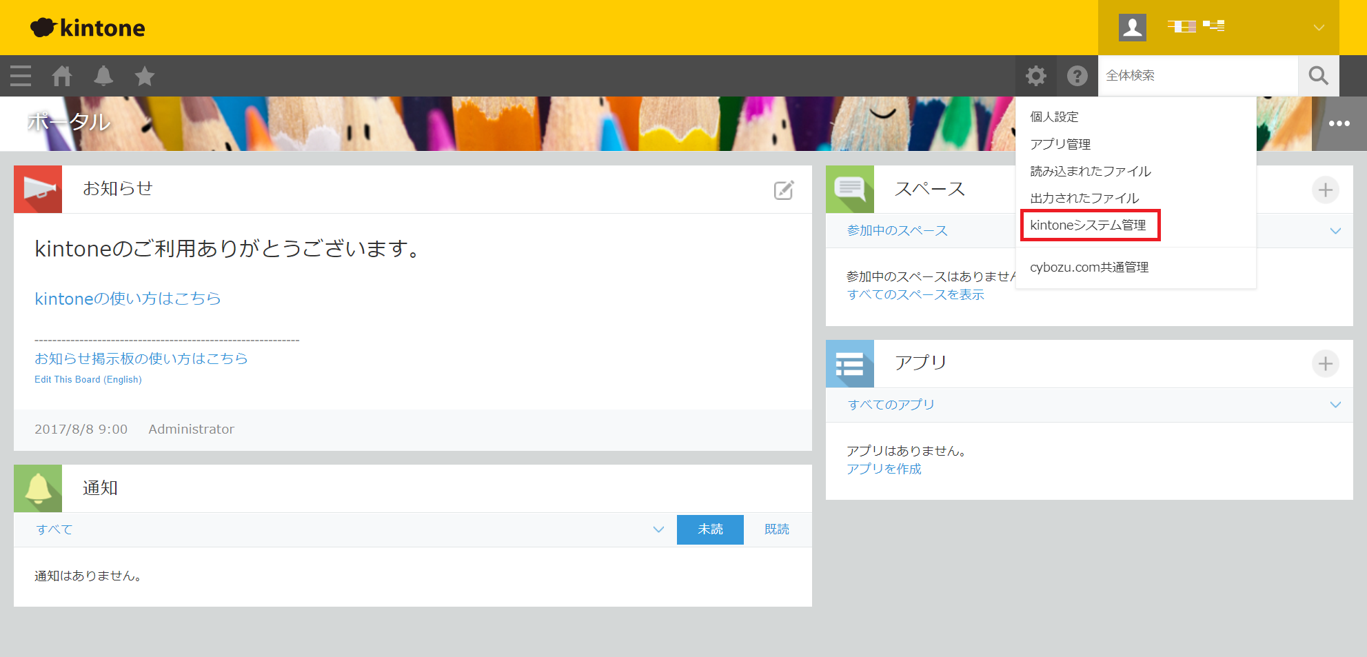 ポータル画面より、「kintoneシステム管理」を選択します。
