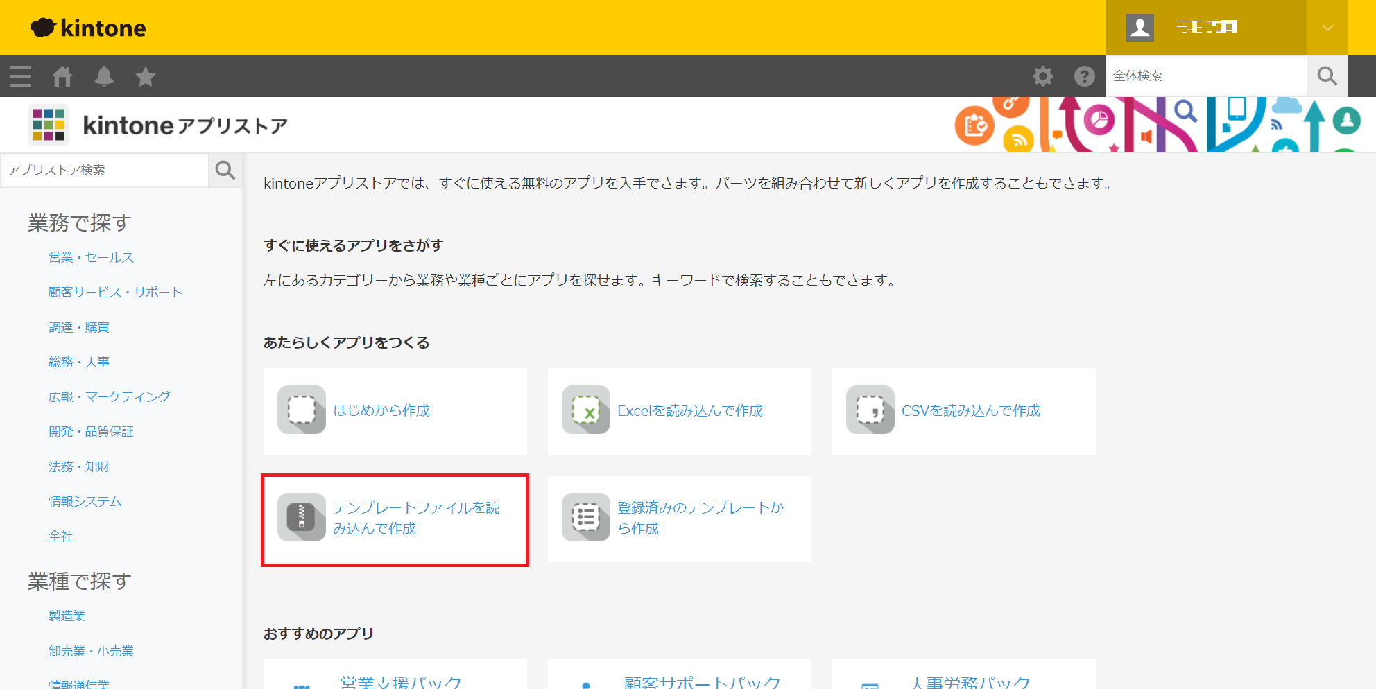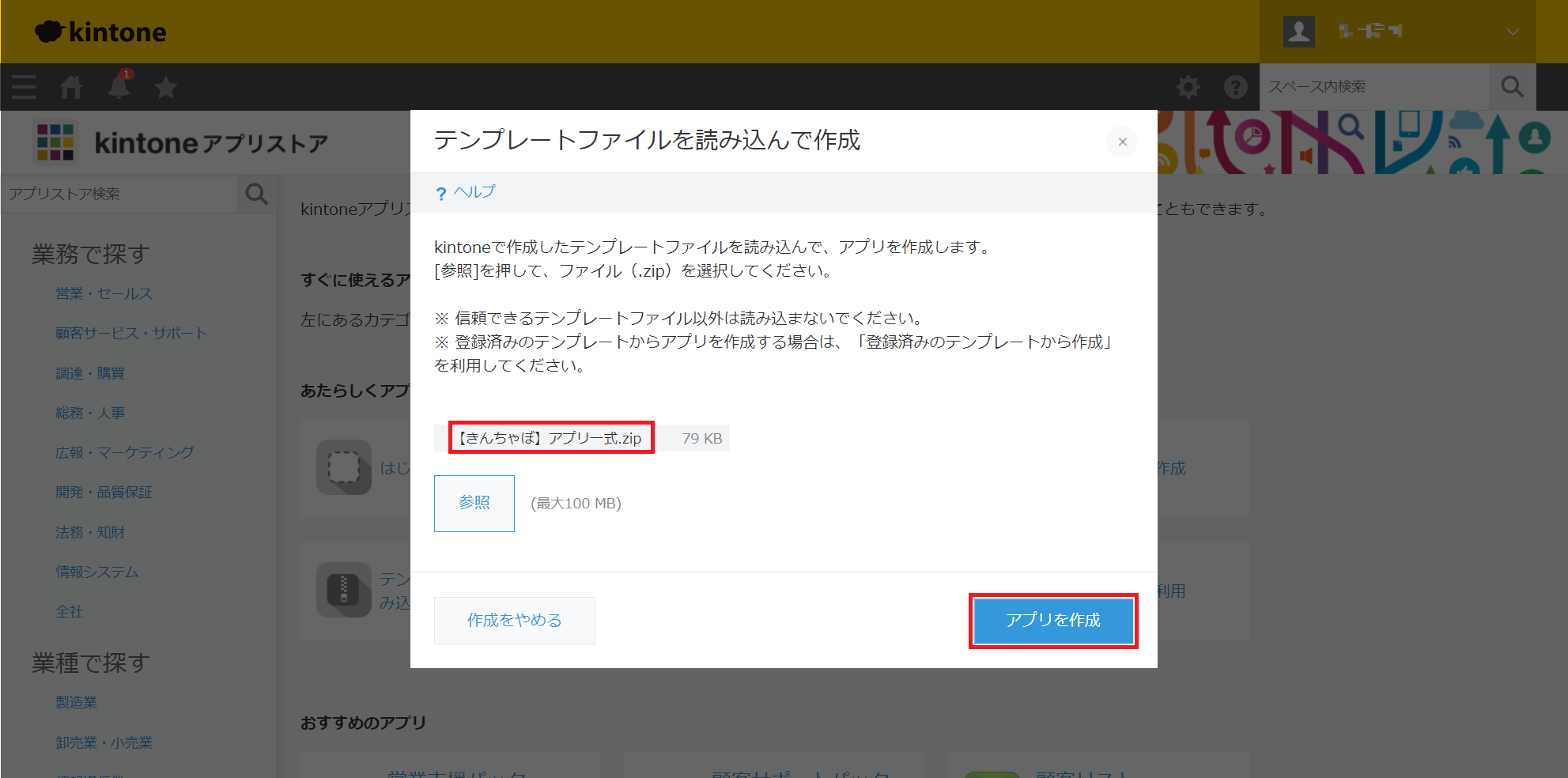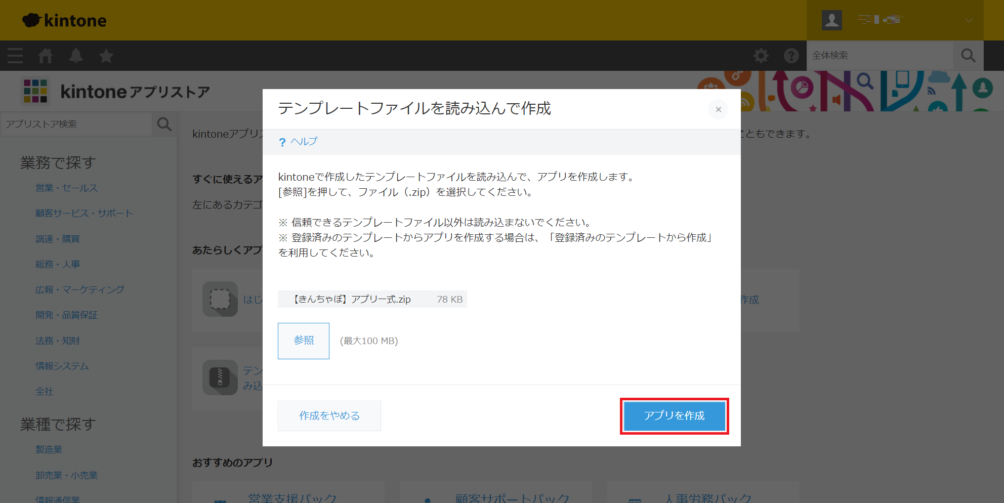 テンプレートファイルを読み込んで作成を選択し、CBサポートから受け取った「【きんちゃぼ】アプリ一式.zip」を選択してアプリを追加します。