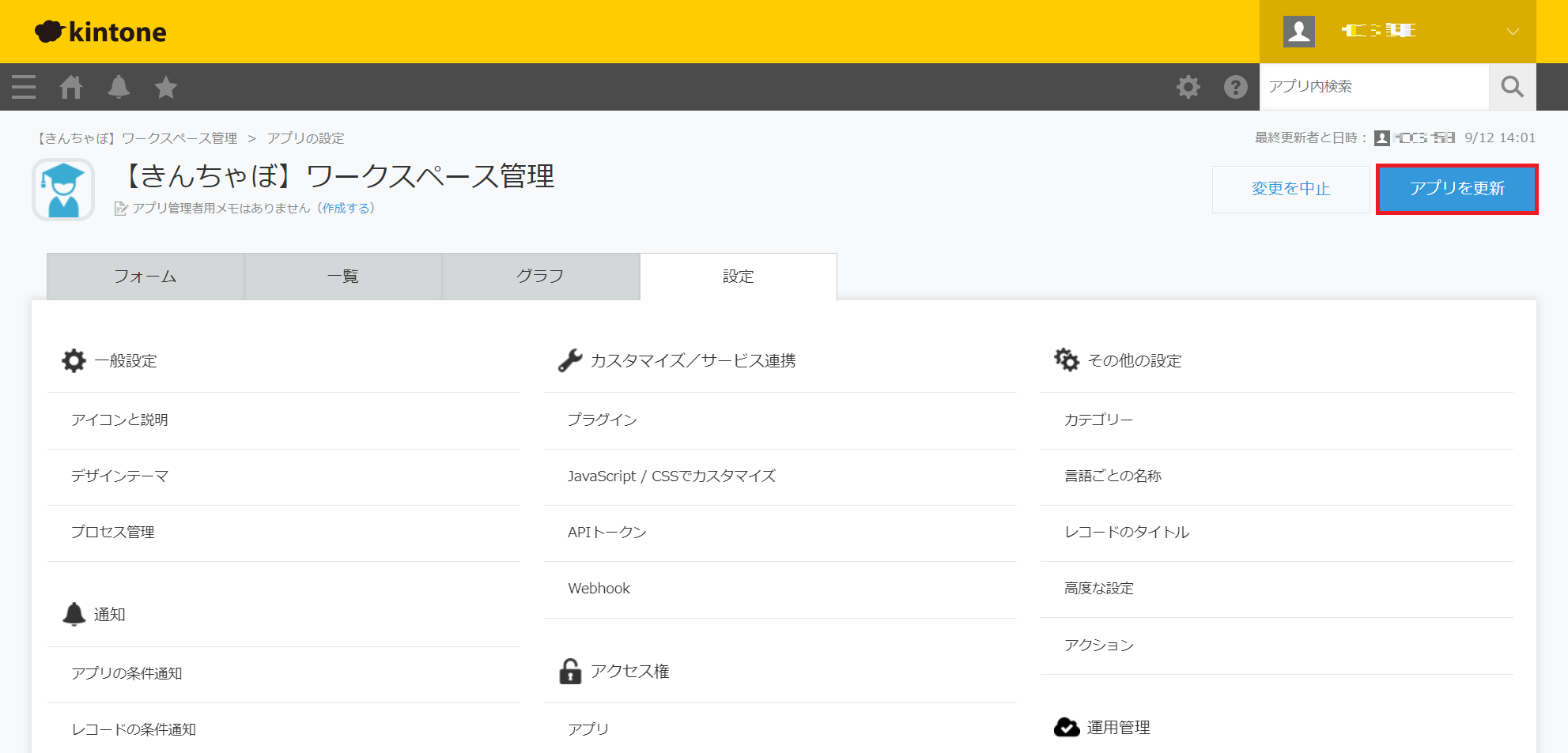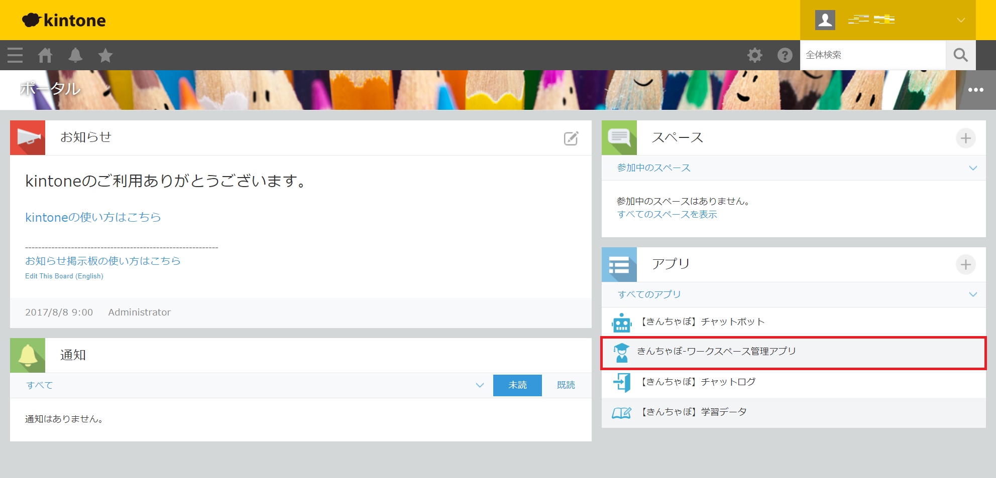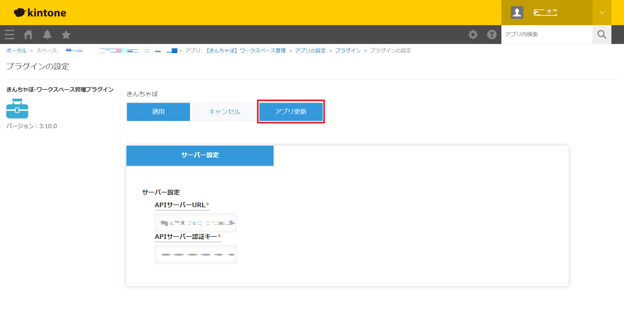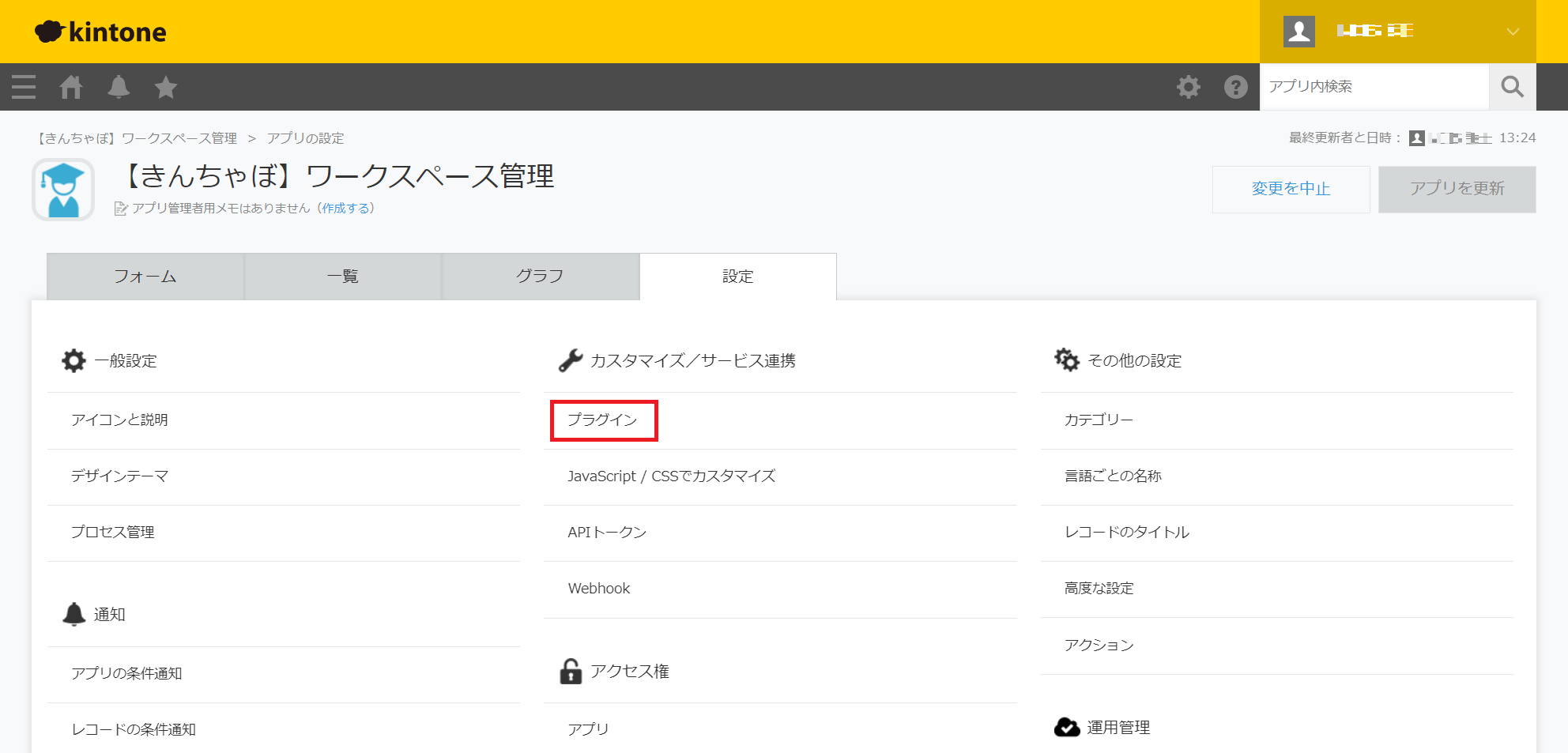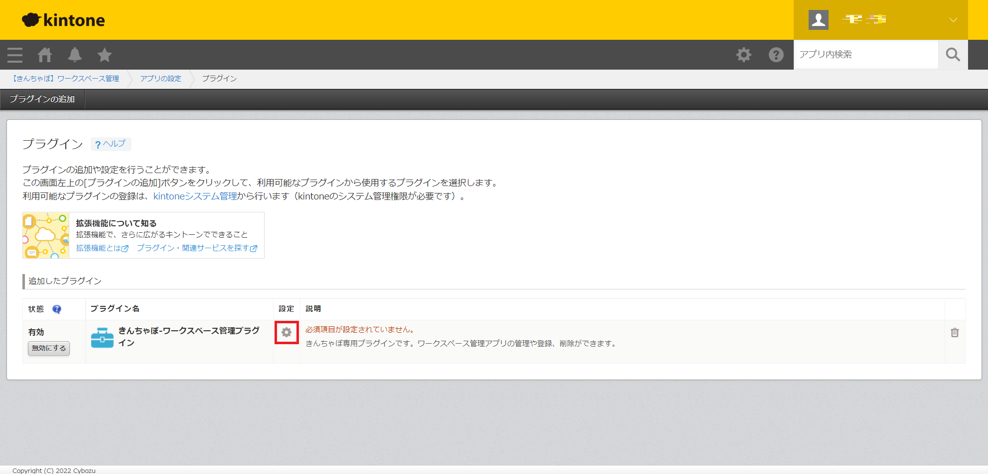 アプリ一覧画面上部の赤いバーのリンク(プラグイン「きんちゃぼ-ワークスペース管理プラグイン」の設定が必要です。)を選択します。