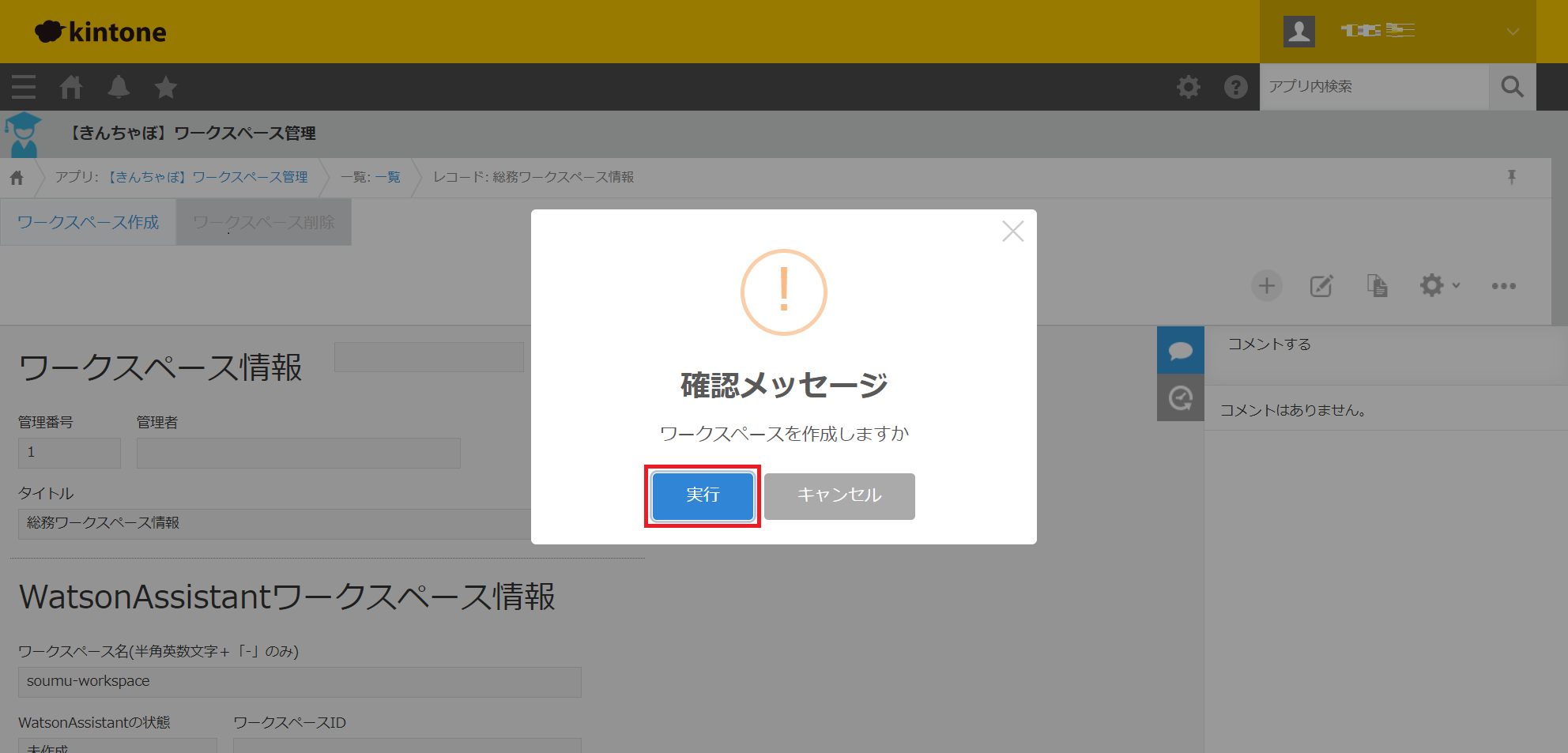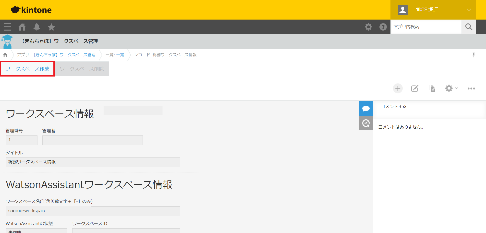 保存後に、登録したレコード画面の「ワークスペース作成」を選択します。