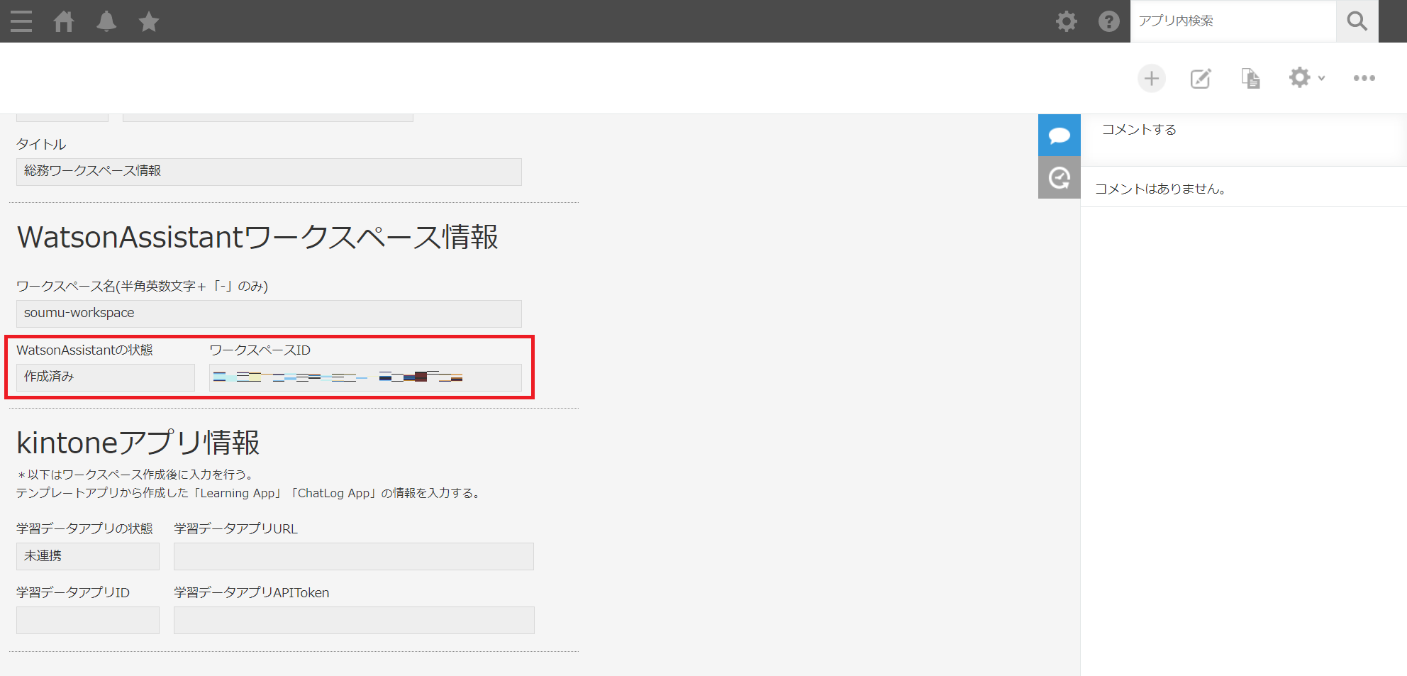 画面上のWatson Assistantワークスペース情報のWatson Assistantの状態に「作成済み」、ワークスペースIDに作成した「ワークスペースID」が登録されます。