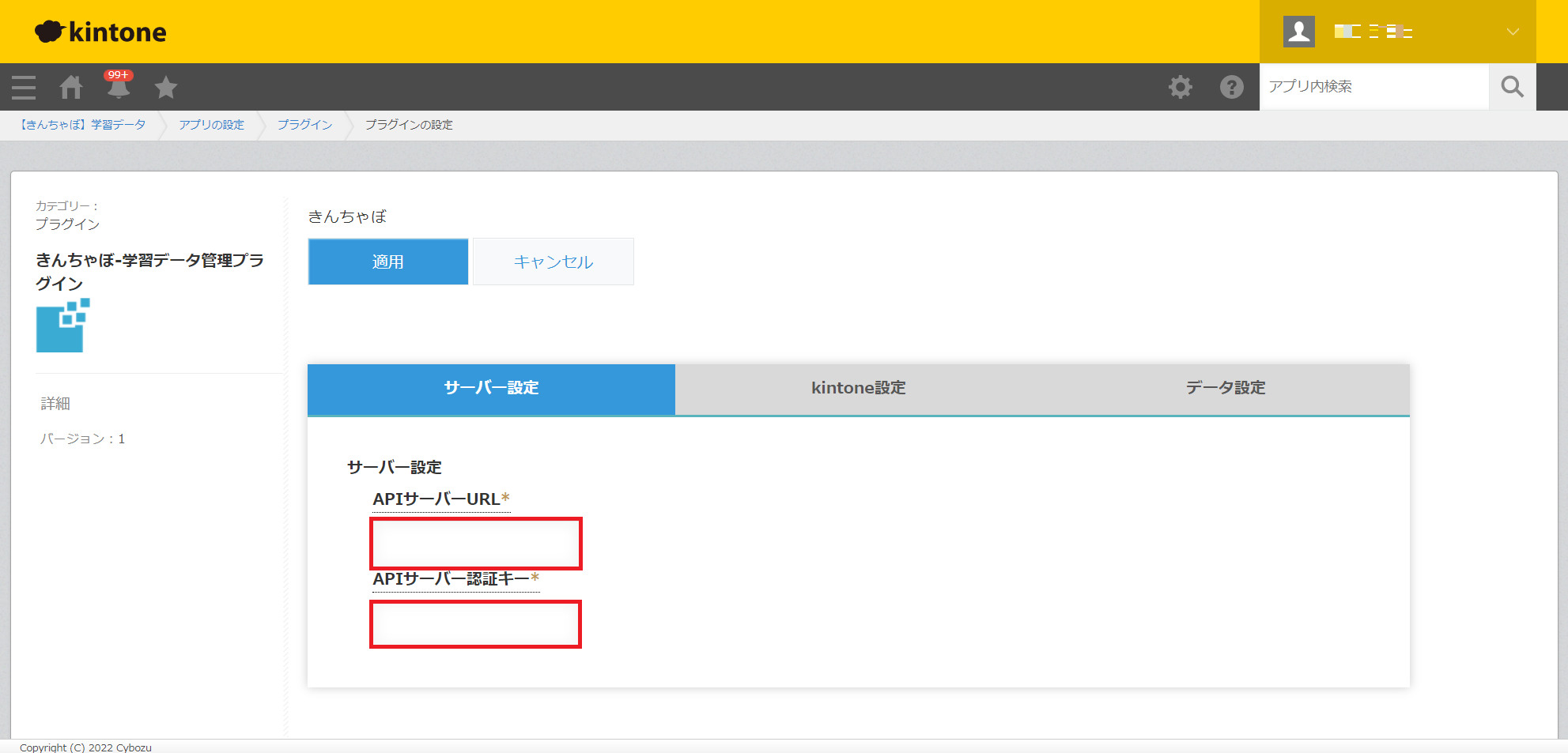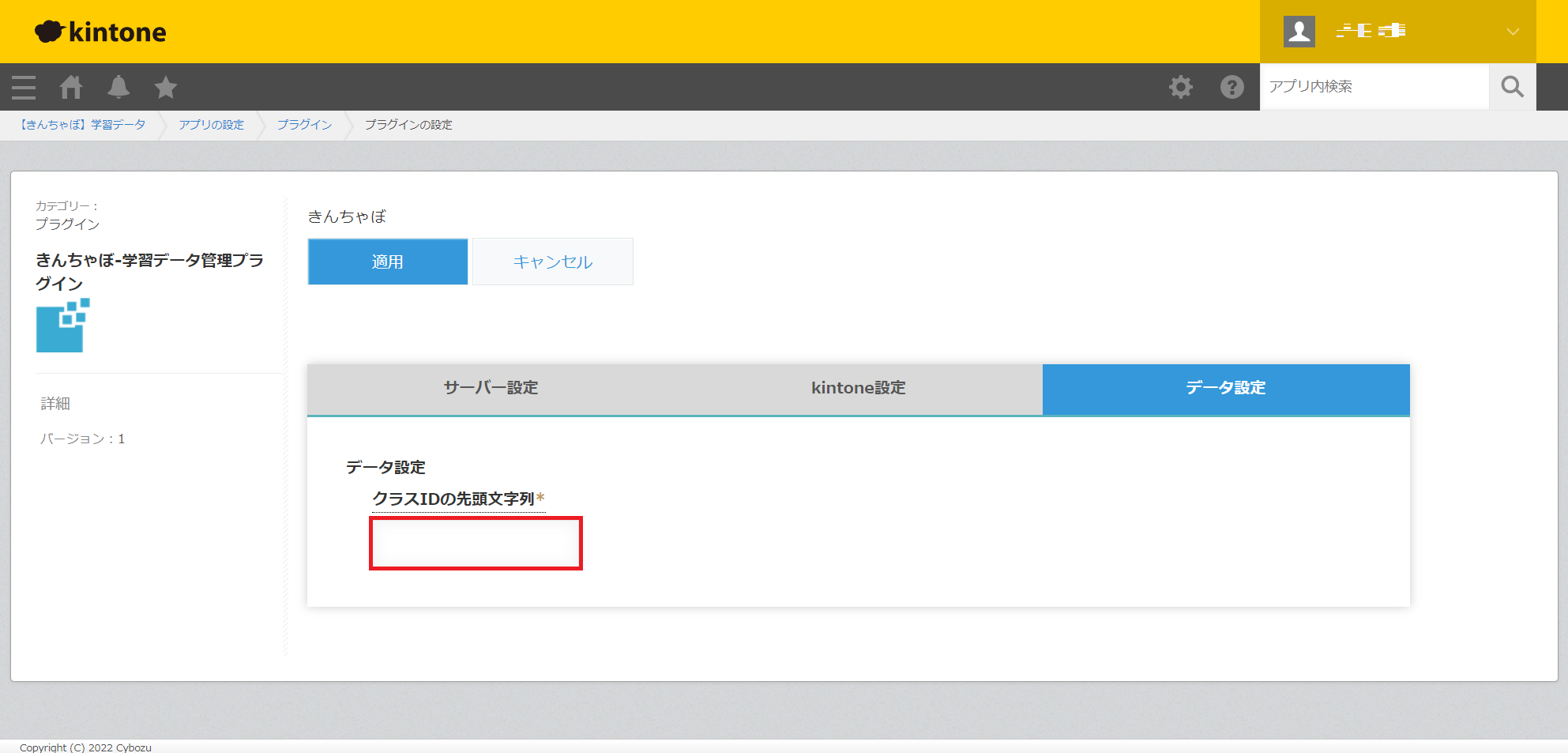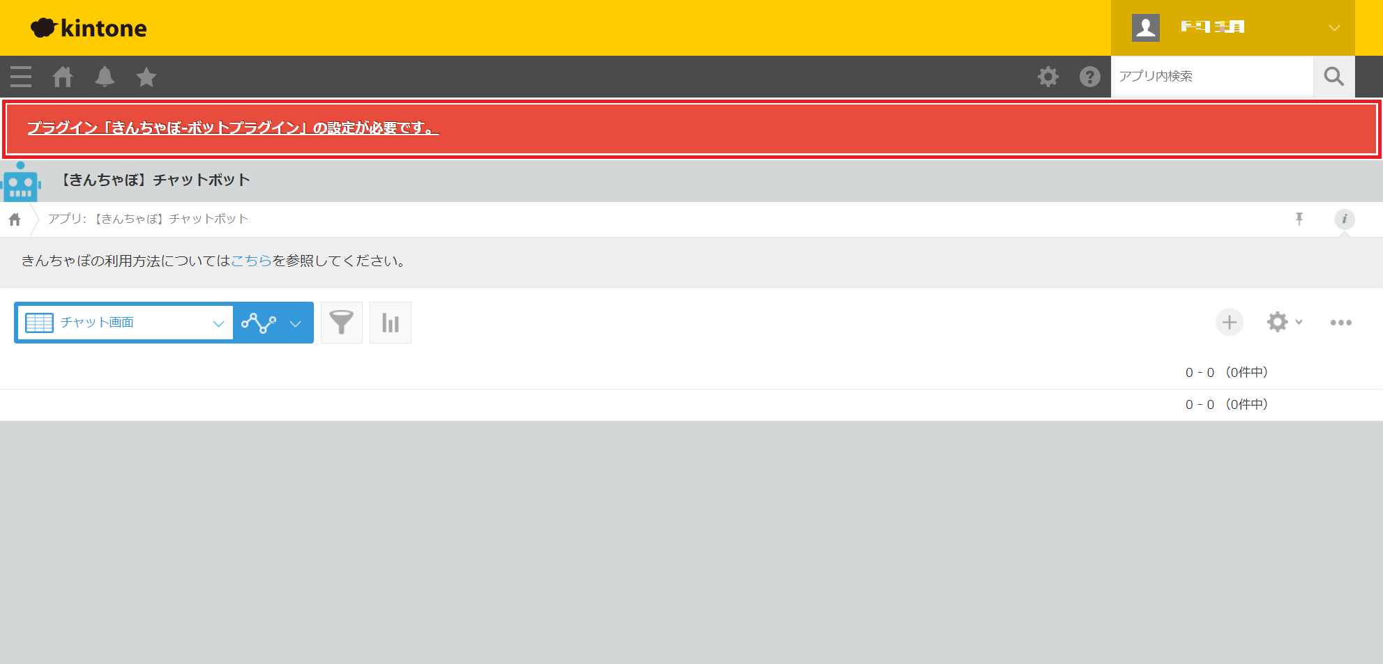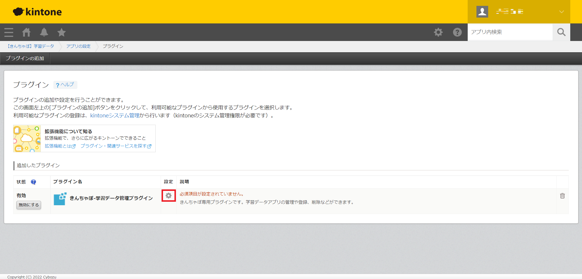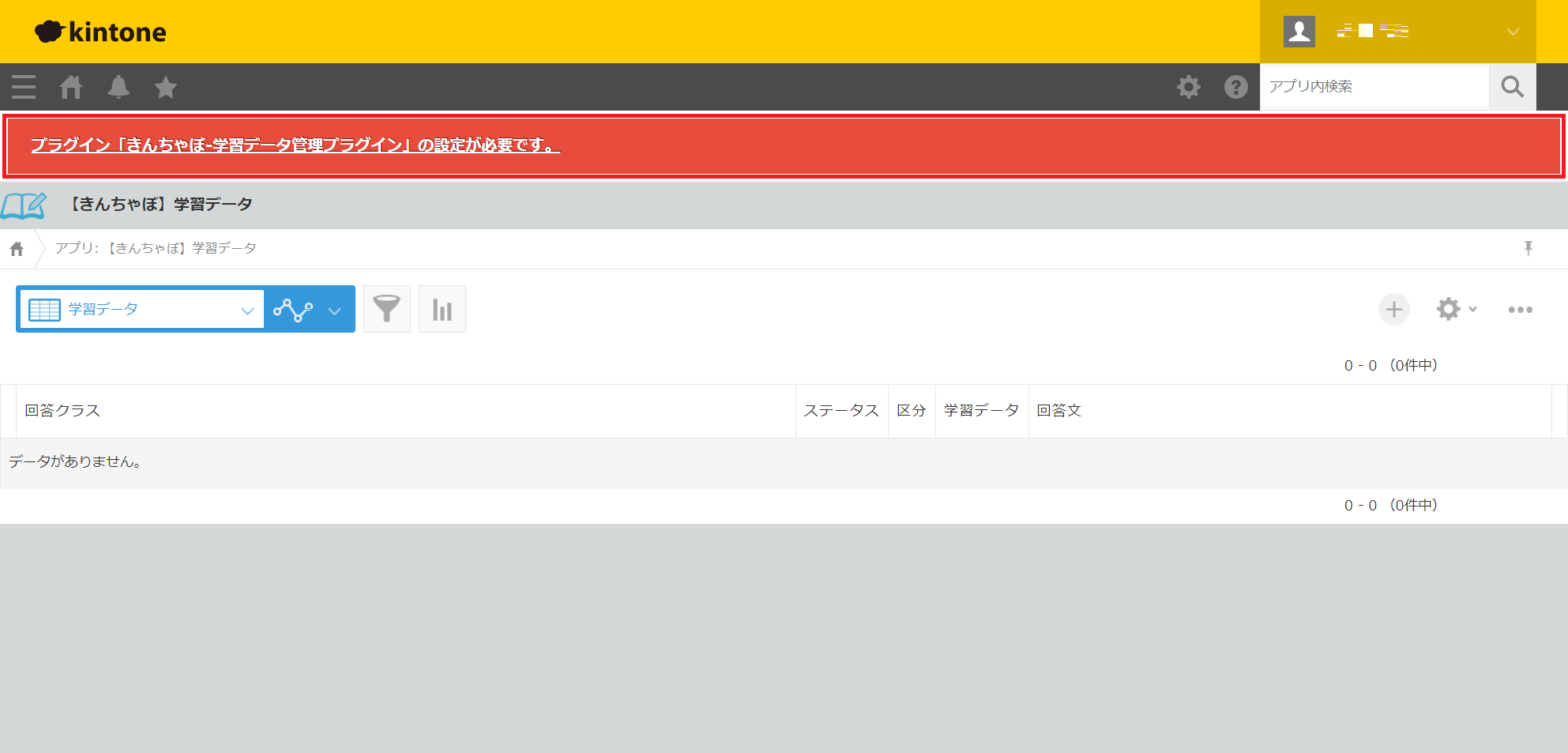 次に学習データアプリ上に表示されている赤いバー「プラグイン「きんちゃぼ-学習データプラグイン」の設定が必要です。」のリンクを選択します。