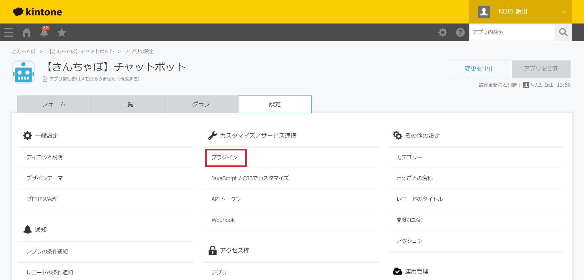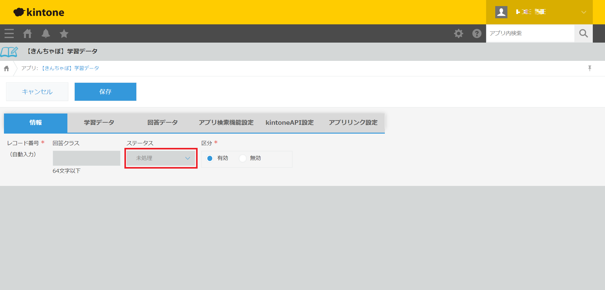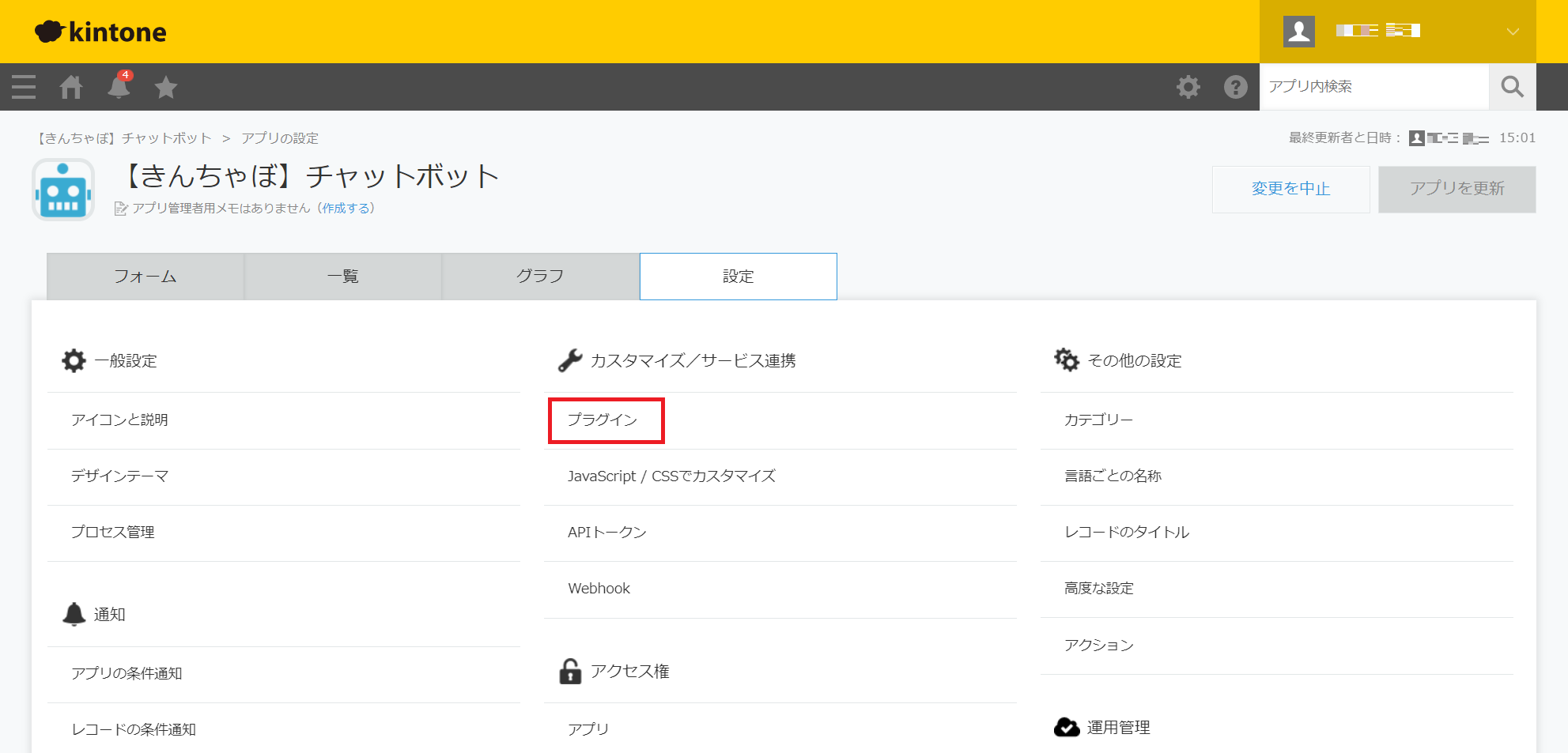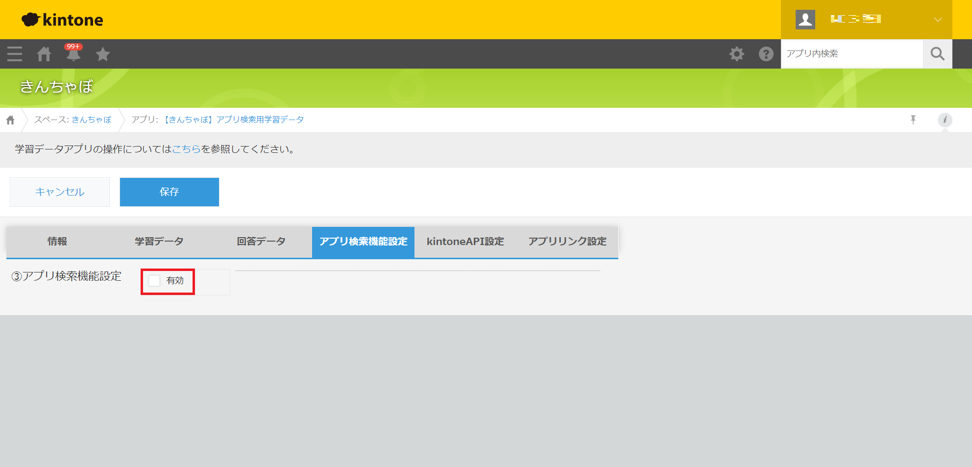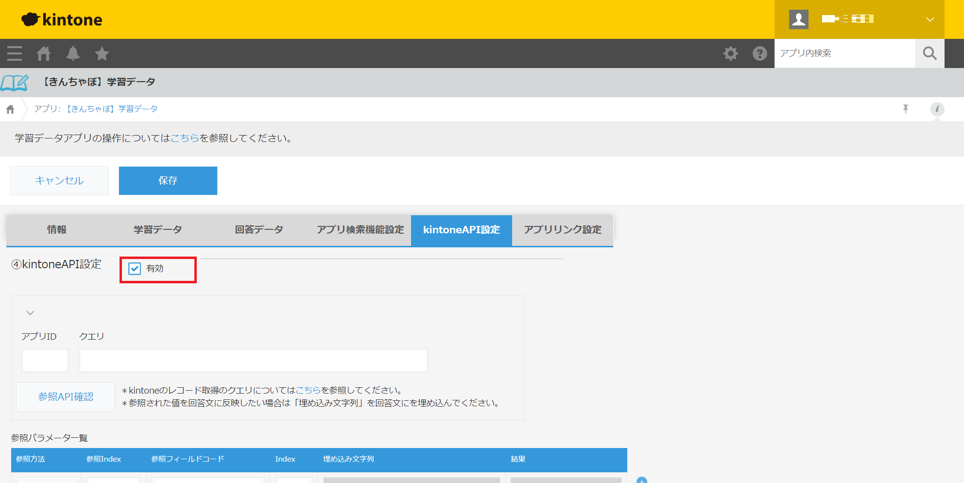 次に学習データアプリ上に表示されている赤いバー「プラグイン「きんちゃぼ-学習データプラグイン」の設定が必要です。」のリンクを選択します。