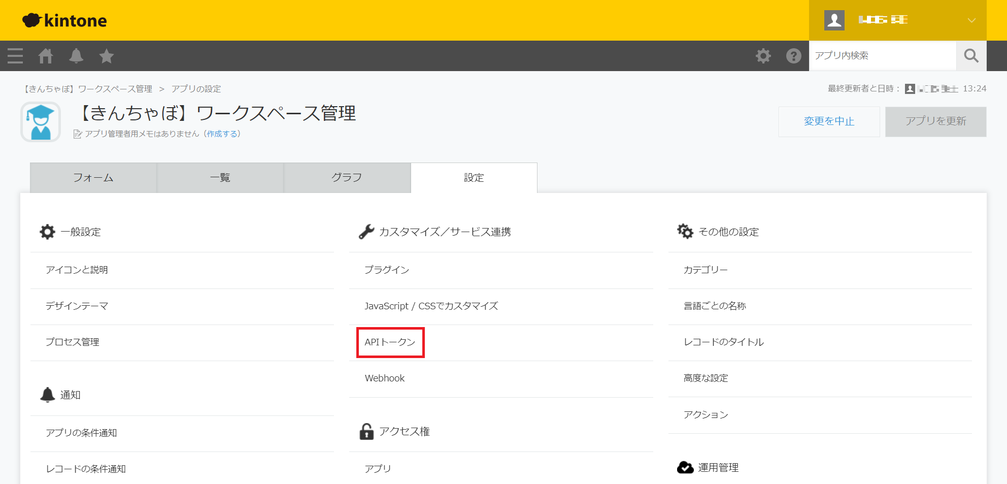 APIトークンを生成するため、歯車ボタン「アプリの設定を変更する」を選択します。