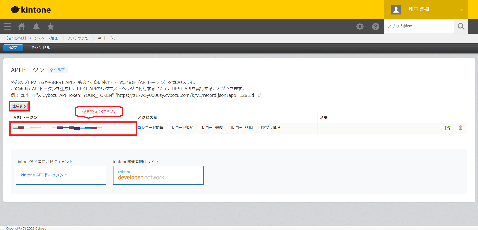※他アプリのプラグイン設定の際に必要となりますので、メモ帳などに「APIトークン」を控えてください。