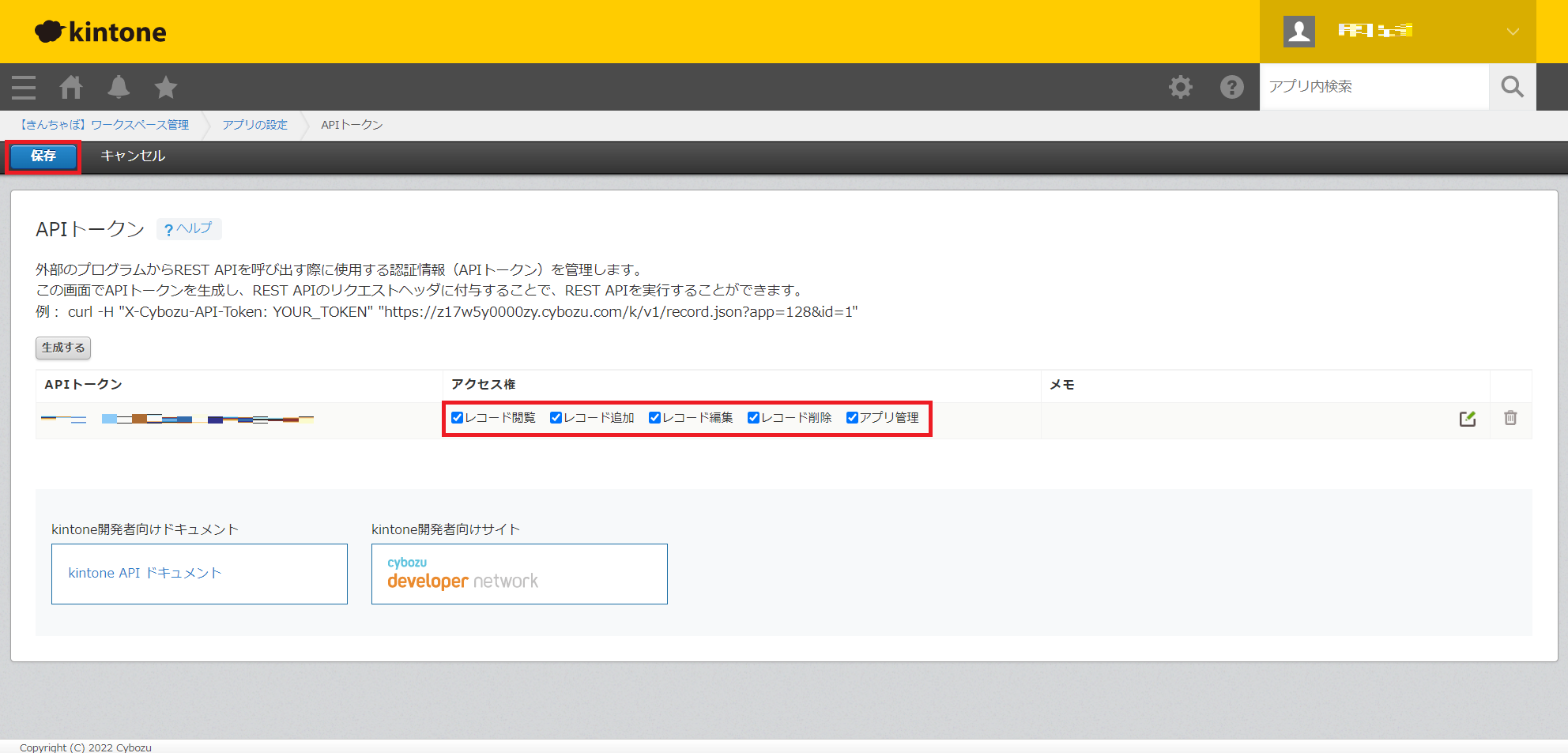 APIトークンのアクセス権はすべてにチェックを入れ、「保存」をクリックします。