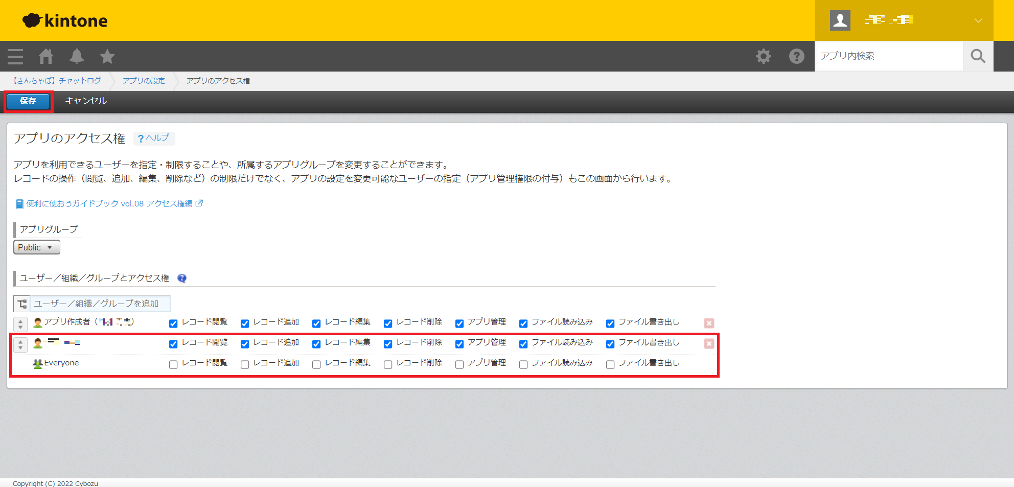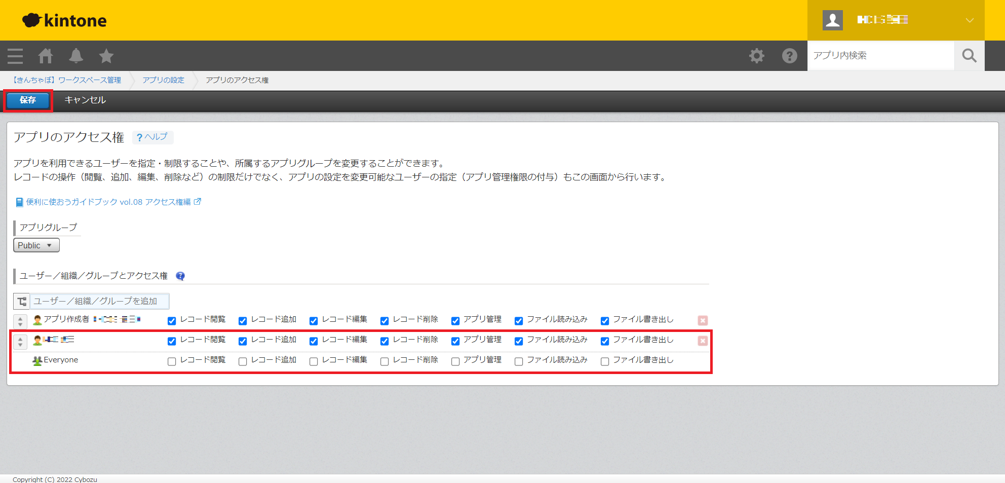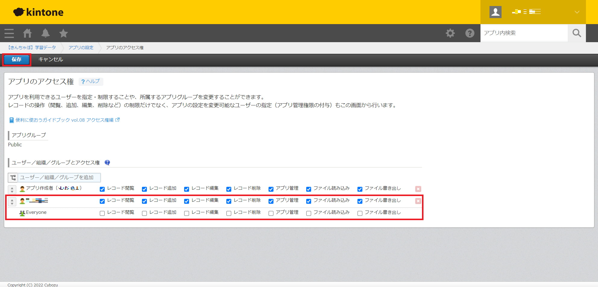 「Everyone」のアクセス権のチェックを全て外します。 また、アプリ作成者、Everyoneの間にアプリを管理したいユーザーが別にいれば追加します。 この時、アプリを管理したいユーザーはアプリ作成者と権限を同じにします。 アプリのアクセス権を設定したら、「保存」をクリックします。