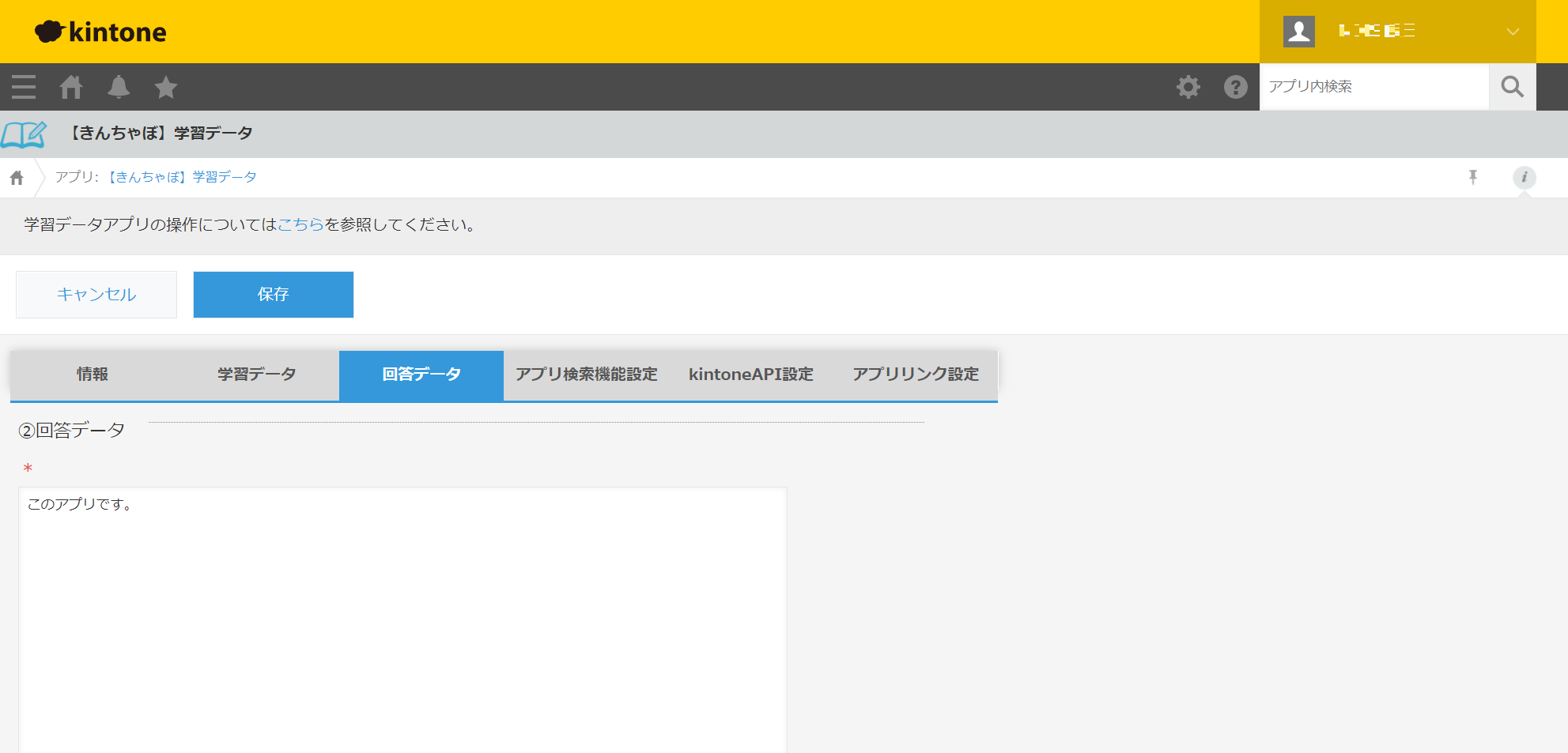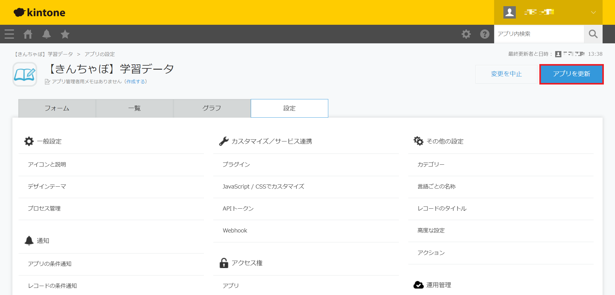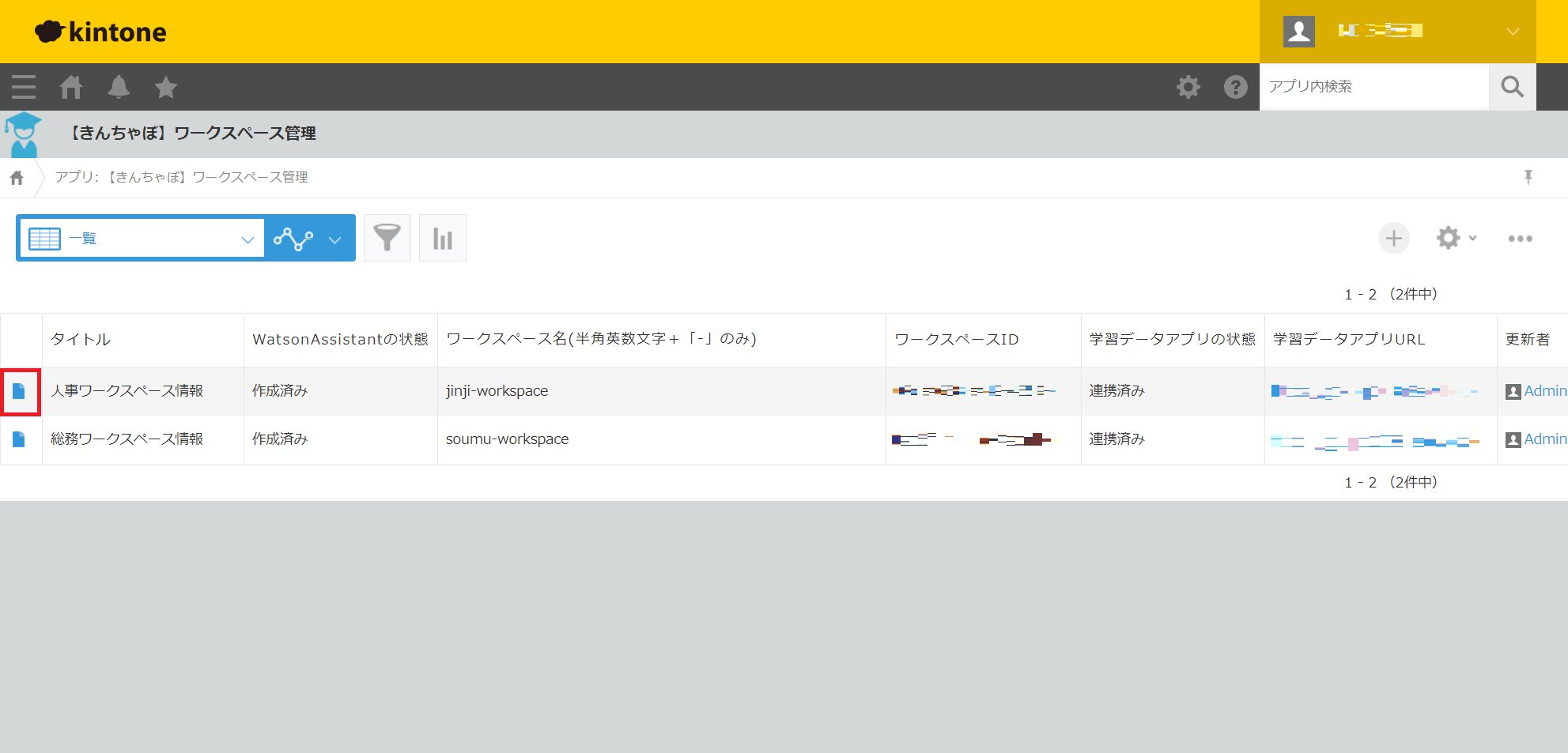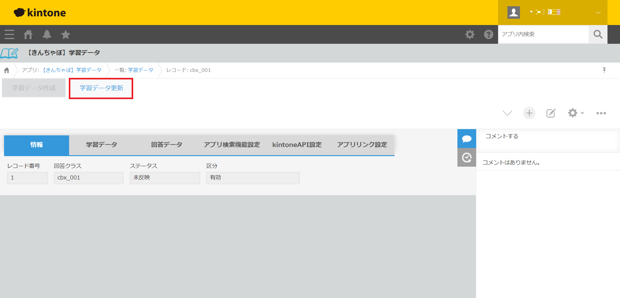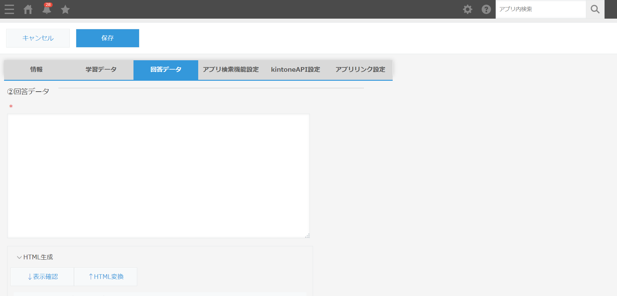 次に、学習データアプリを開き、「ワークスペース管理アプリの設定」の手順を参照し、ワークスペース管理アプリと同様に「APIトークンの生成」から「アプリを更新」までを実施します。 その際同様にAPIトークンとアプリIDを控えます。