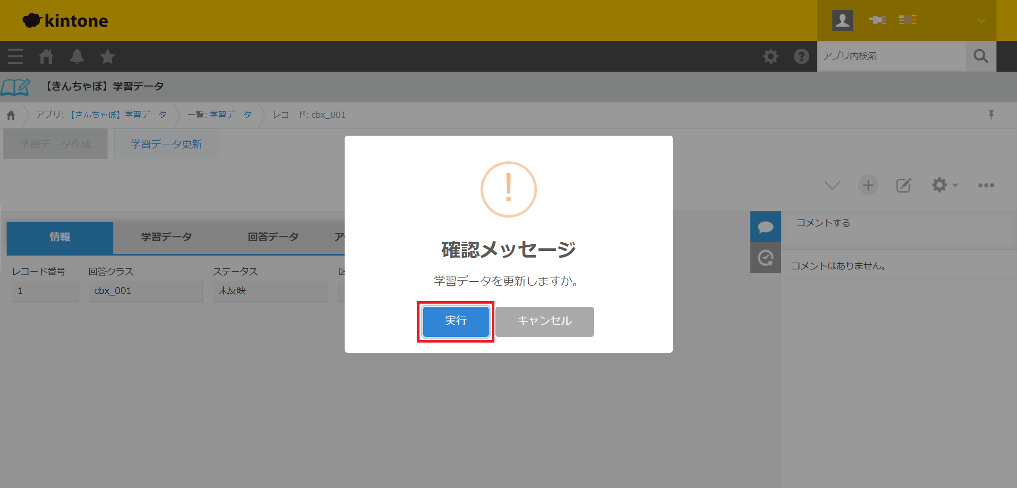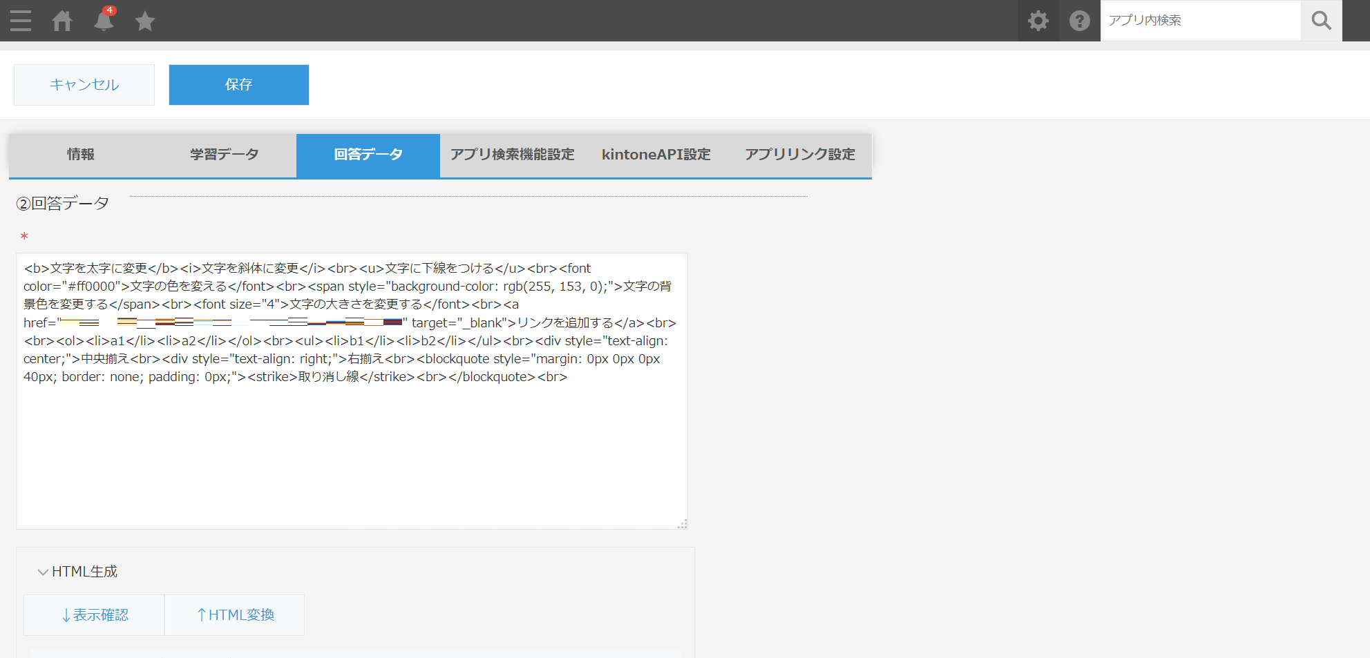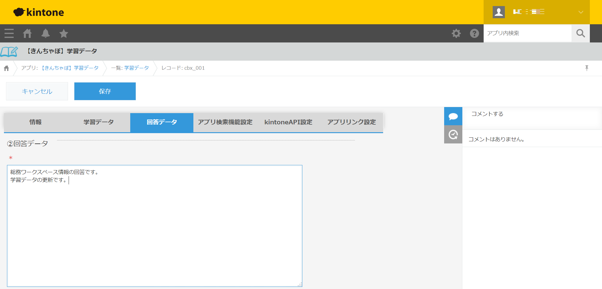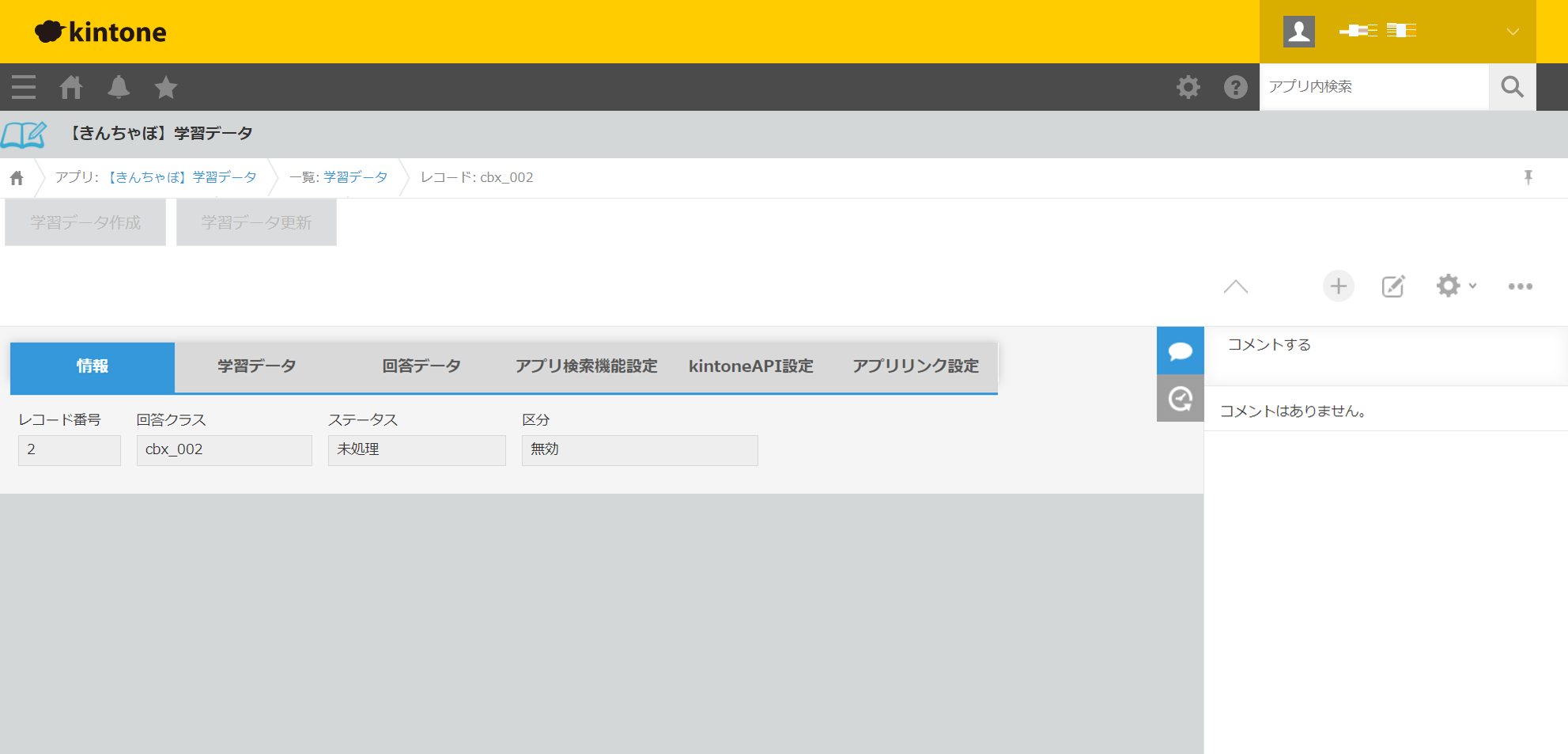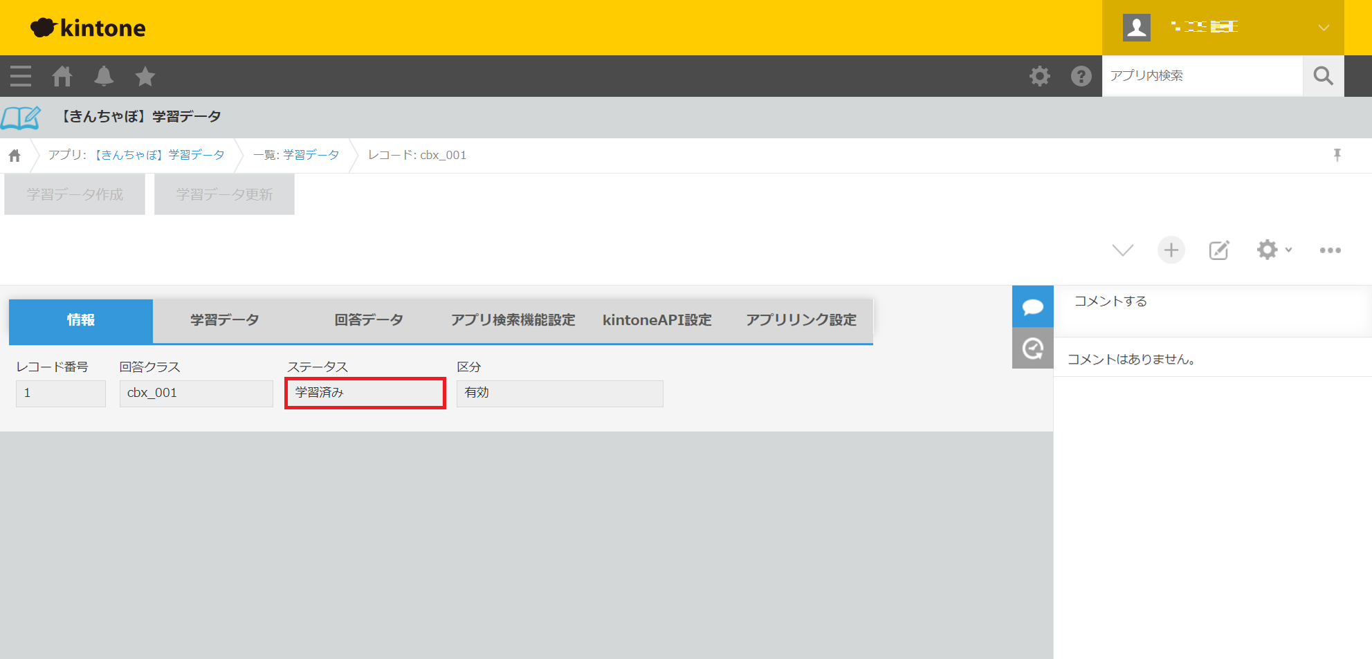 次に、学習データアプリを開き、「ワークスペース管理アプリの設定」の手順を参照し、ワークスペース管理アプリと同様に「APIトークンの生成」から「アプリを更新」までを実施します。 その際同様にAPIトークンとアプリIDを控えます。