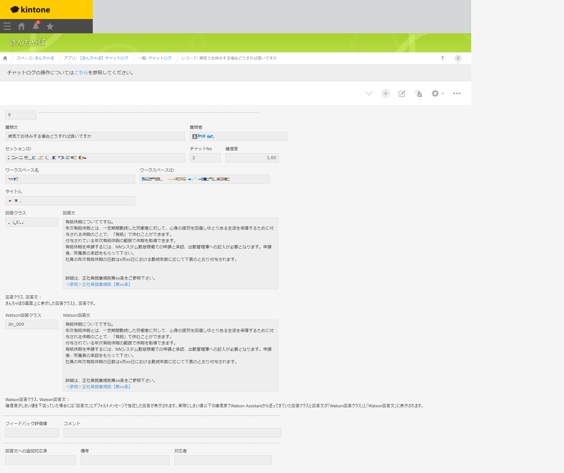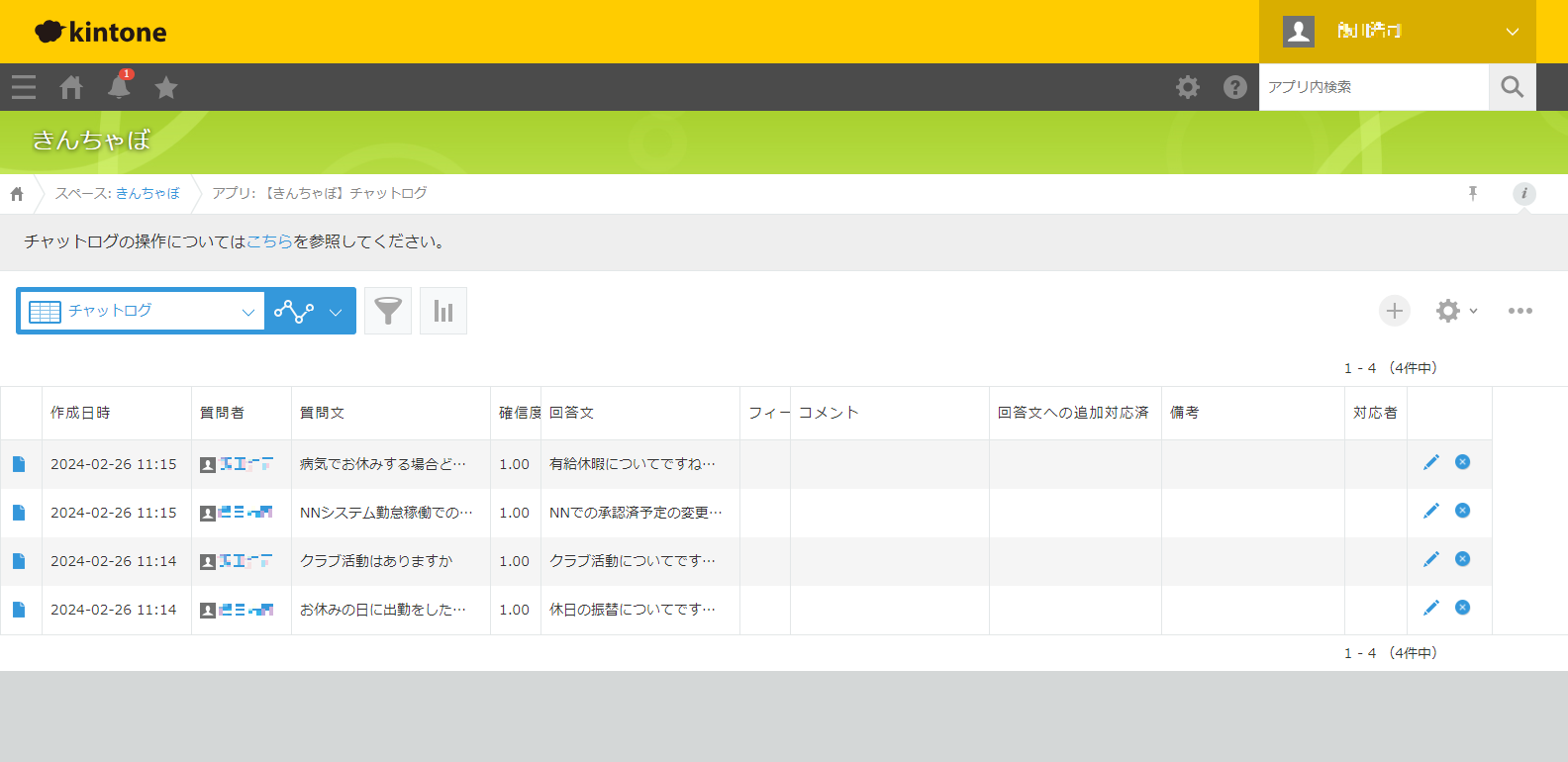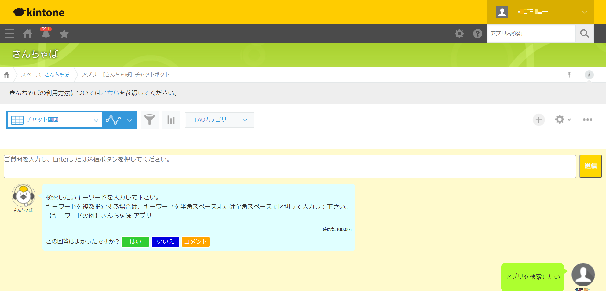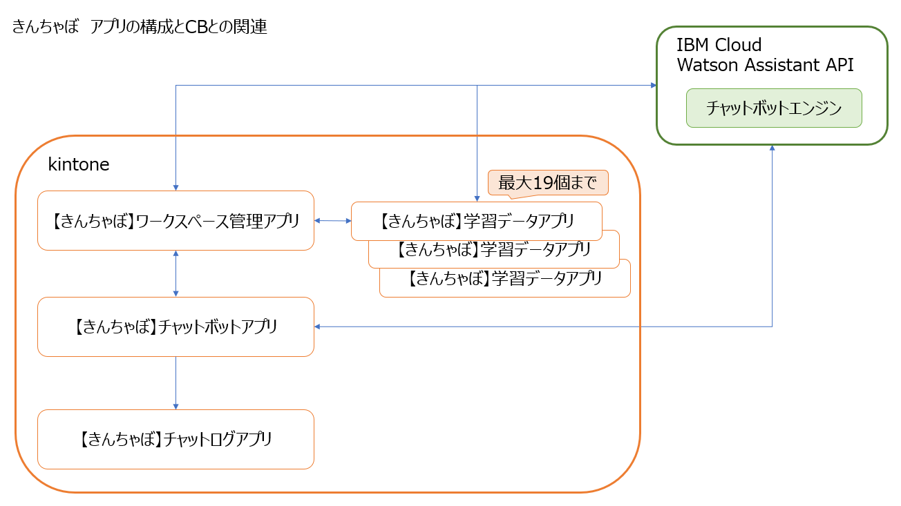 きんちゃぼは、kintone上の4つのアプリ「【きんちゃぼ】ワークスペース管理」、「【きんちゃぼ】学習データ」、「【きんちゃぼ】チャットボット」、「【きんちゃぼ】チャットログ」とチャットボットエンジンから構成されています。 ワークスペース管理アプリにワークスペース(質問と回答を学習するエリア)を作成し、学習データアプリではそのワークスペース単位で質問と回答を登録します。学習データアプリで質問と回答を学習をさせることで、きんちゃぼが質問に対して回答を行えるようになります。 また、チャットログアプリではきんちゃぼへの質問と回答のログを参照することができます。 チャットボットアプリは利用者がチャットボットと会話をするアプリです。