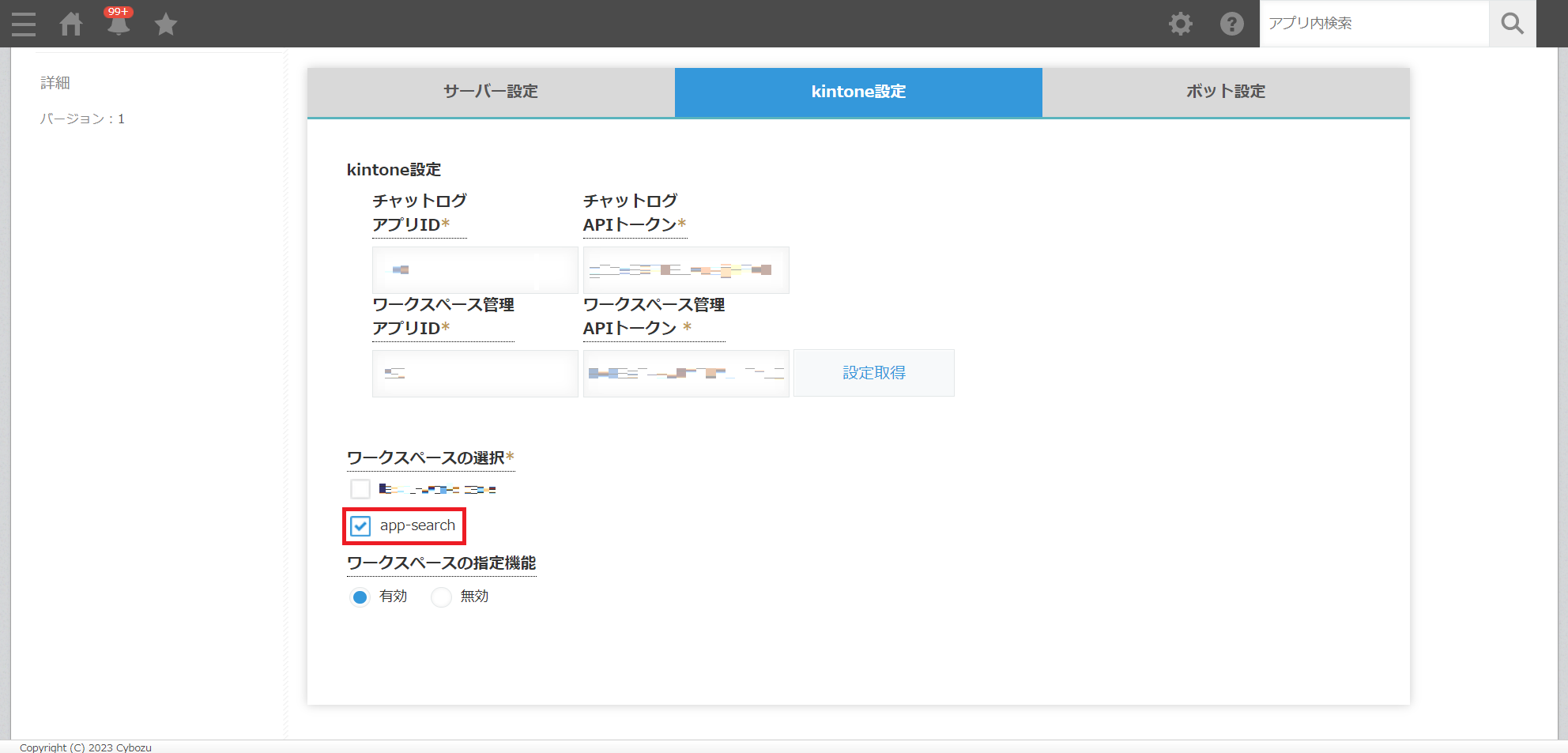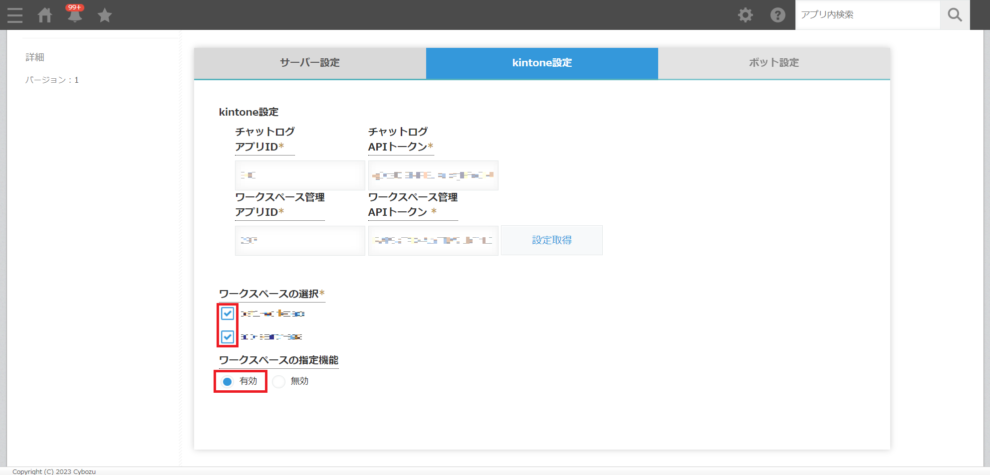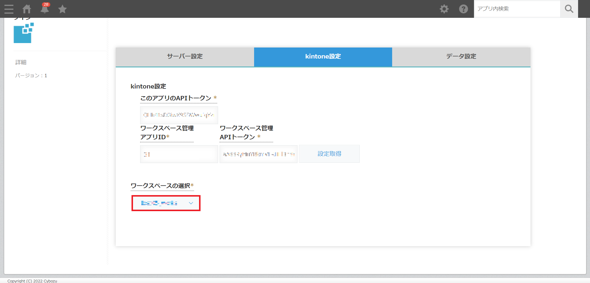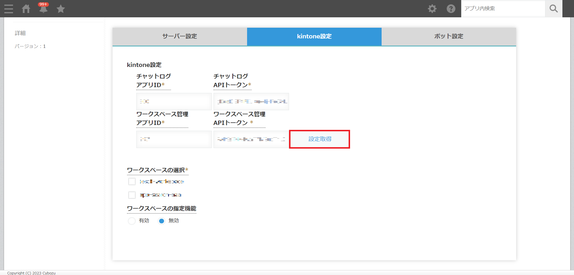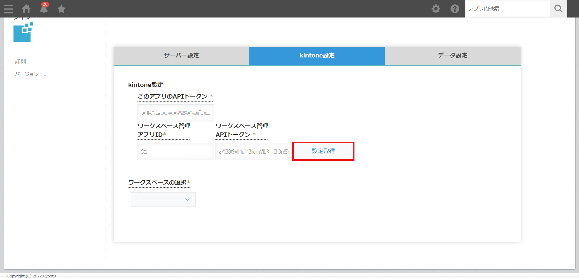 kintone設定タブに先の手順で控えたこのアプリのAPIトークン、ワークスペース管理のアプリID、ワークスペース管理のAPIトークンを入力し、「設定取得」を選択してください。