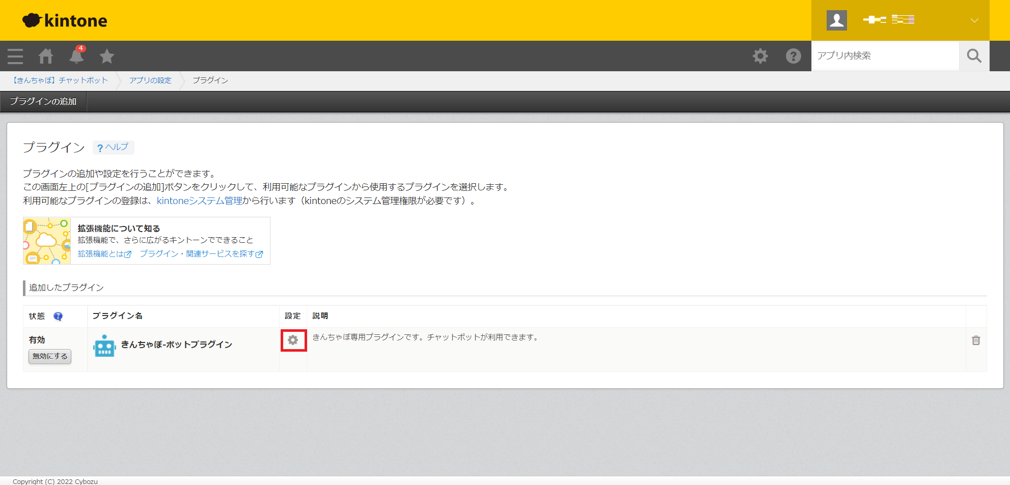 「アプリの設定」の「プラグイン」の画面の歯車ボタンを選択します。