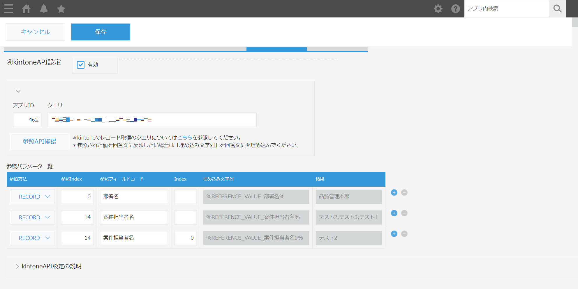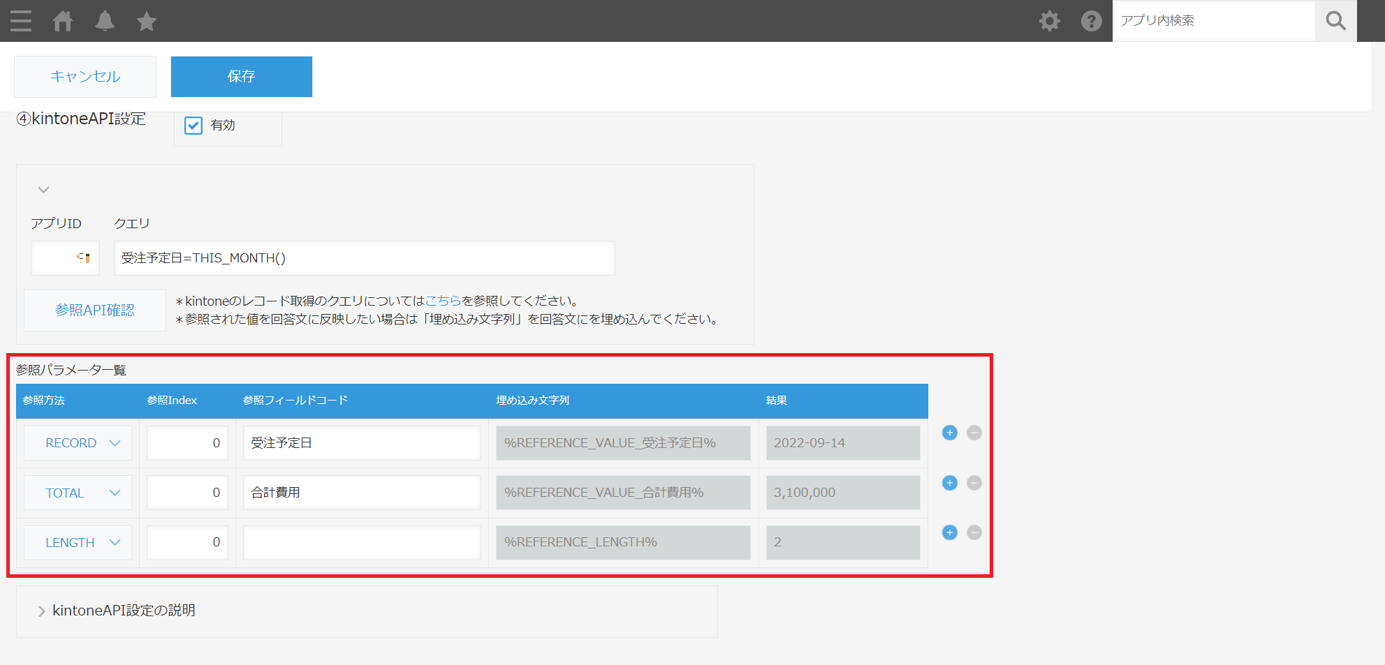 「アプリID」はkintoneのアプリ画面のURLの「https://<サブドメイン>.cybozu.com/k/<アプリID>/」の末尾から取得できます。