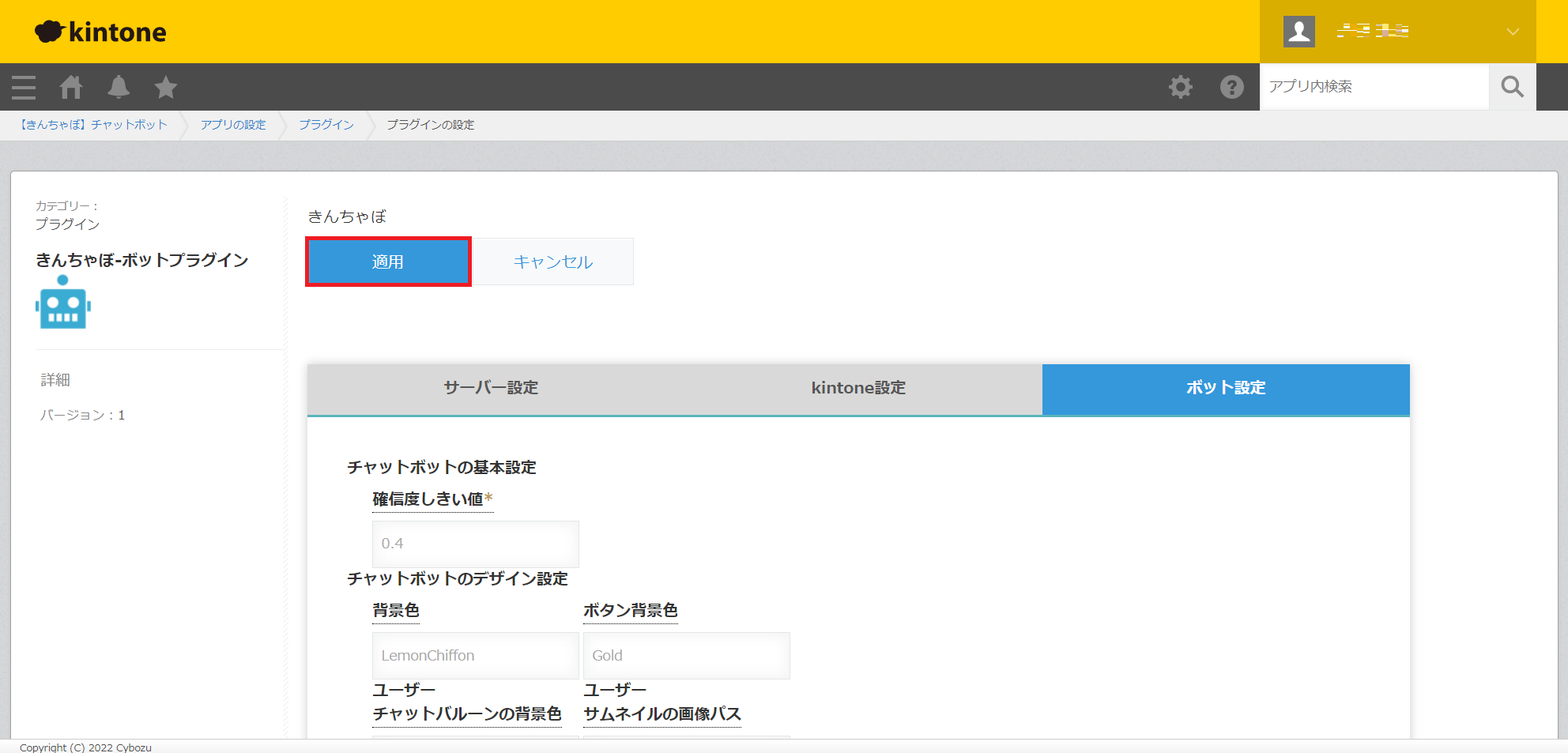 ボット設定タブの「ボット サムネイルの画像パス」にコピーした画像のURLを貼り付け、設定を適用します。