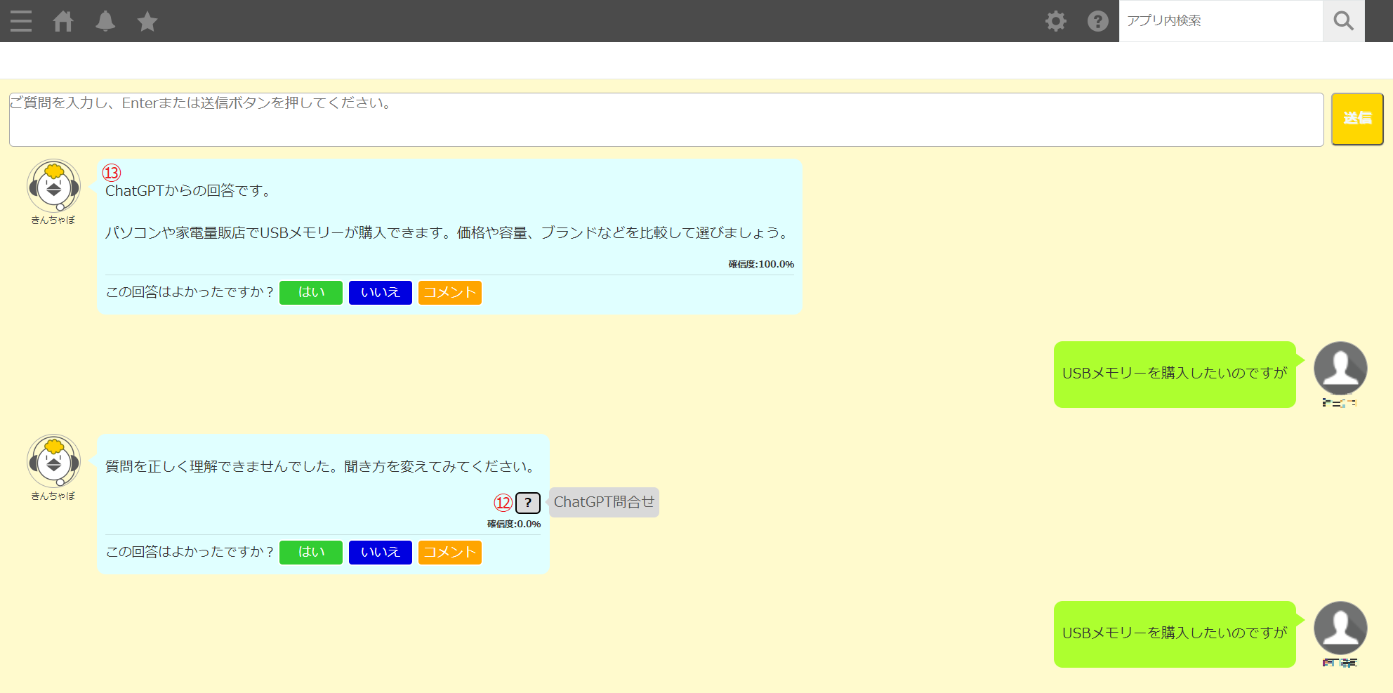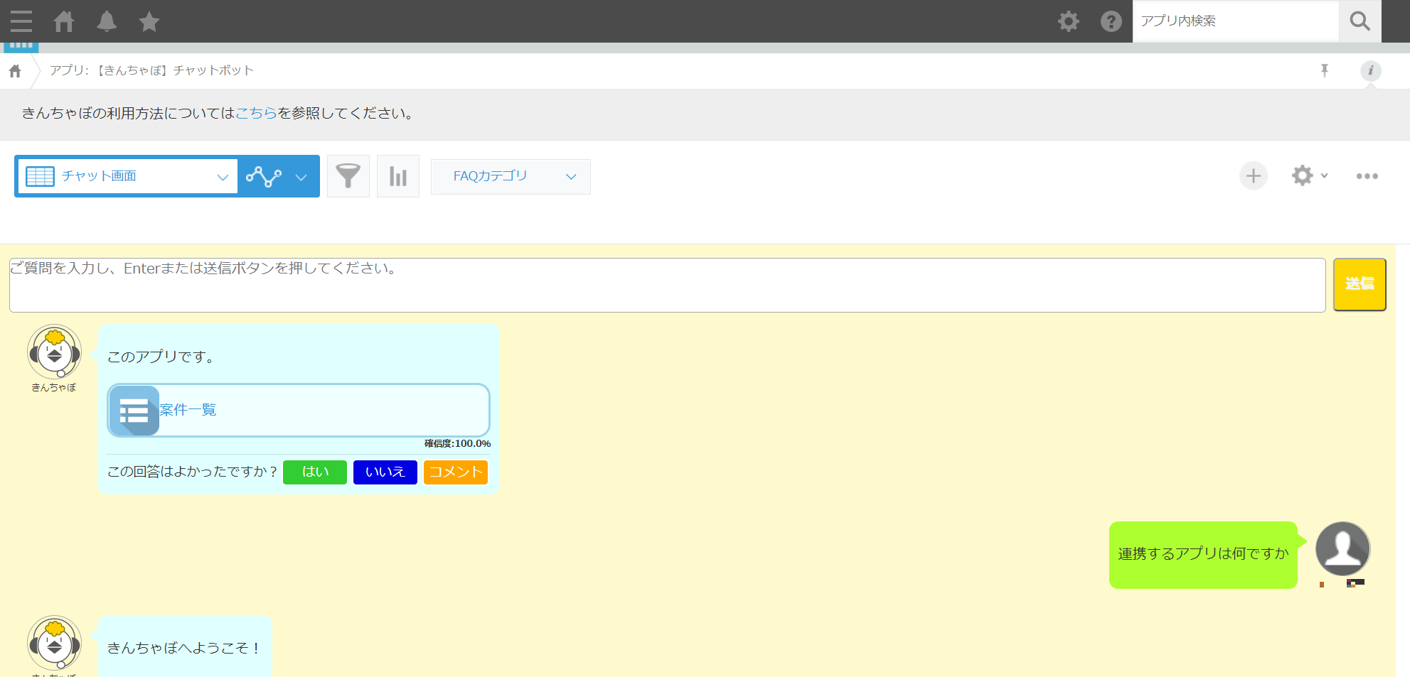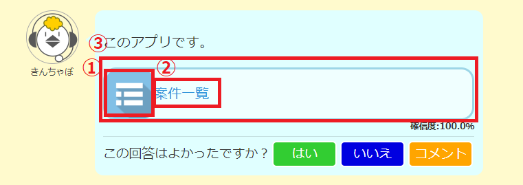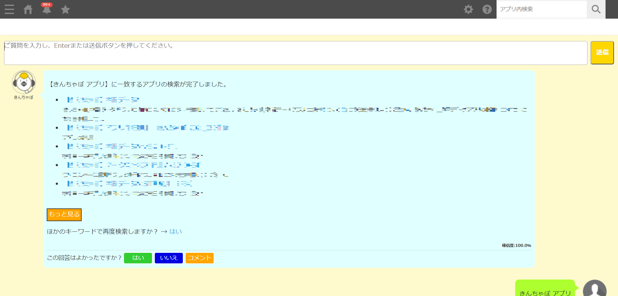チャットボットアプリで、学習させた質問を入力するとリンク形式の質問文を表示させることができます。