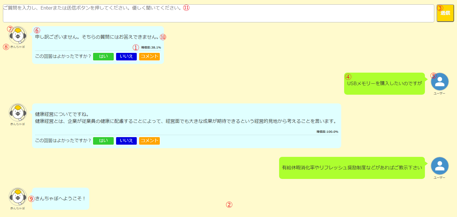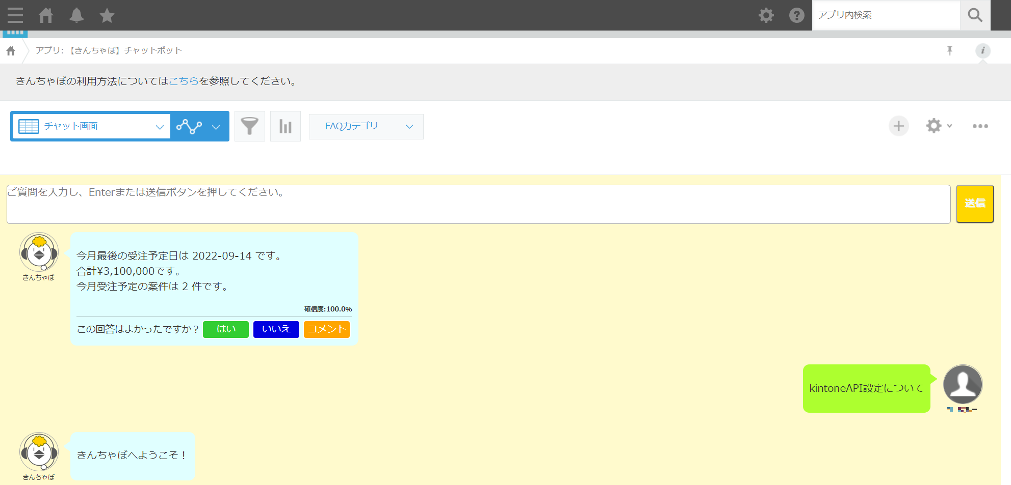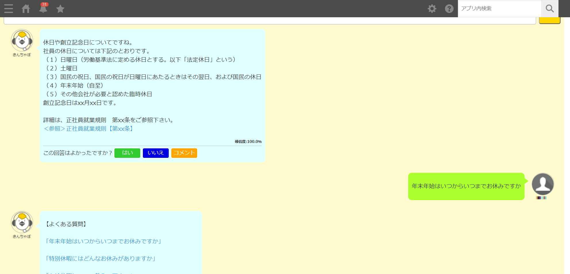 チャットボットアプリで、学習させた質問を入力するとリンク形式の質問文を表示させることができます。