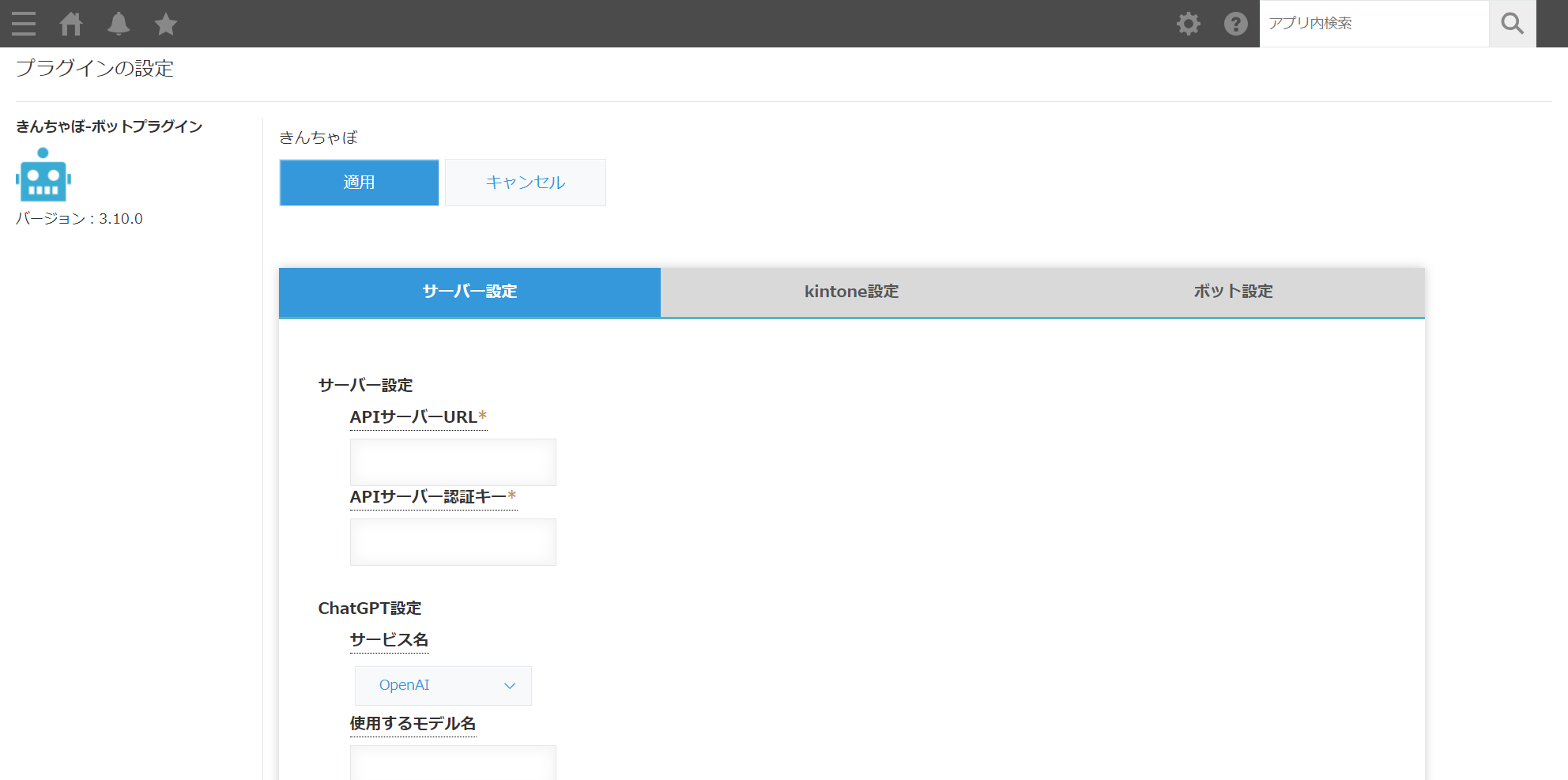 「プラグイン」のサーバー設定タブ画面に必要な情報を入力します。