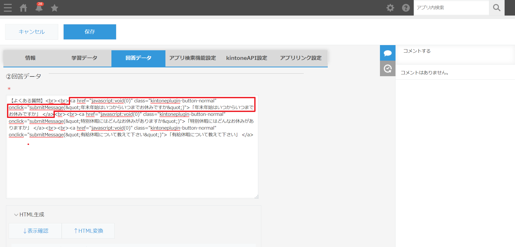 回答データの入力欄にクリックで質問が可能なリンクを作成します。