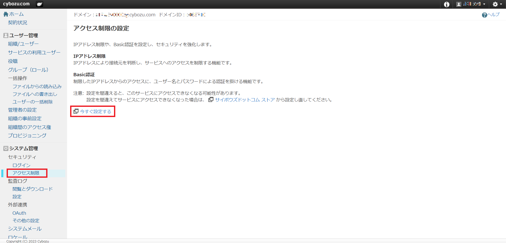 アクセス制限の設定画面が開くので、「今すぐ設定する」をクリックします。