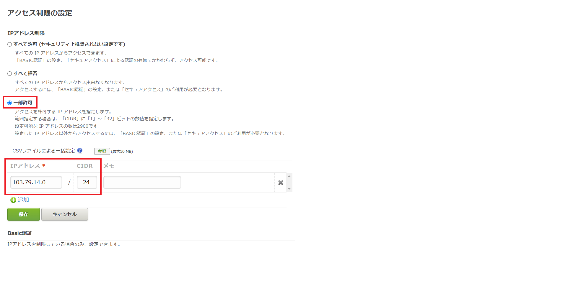 IPアドレス制限が一部許可に設定されている場合、IPアドレスに「103.79.14.0/24」が存在するか確認してください。