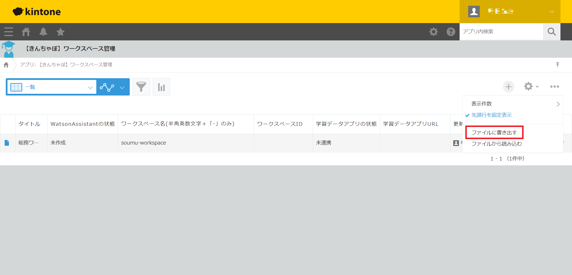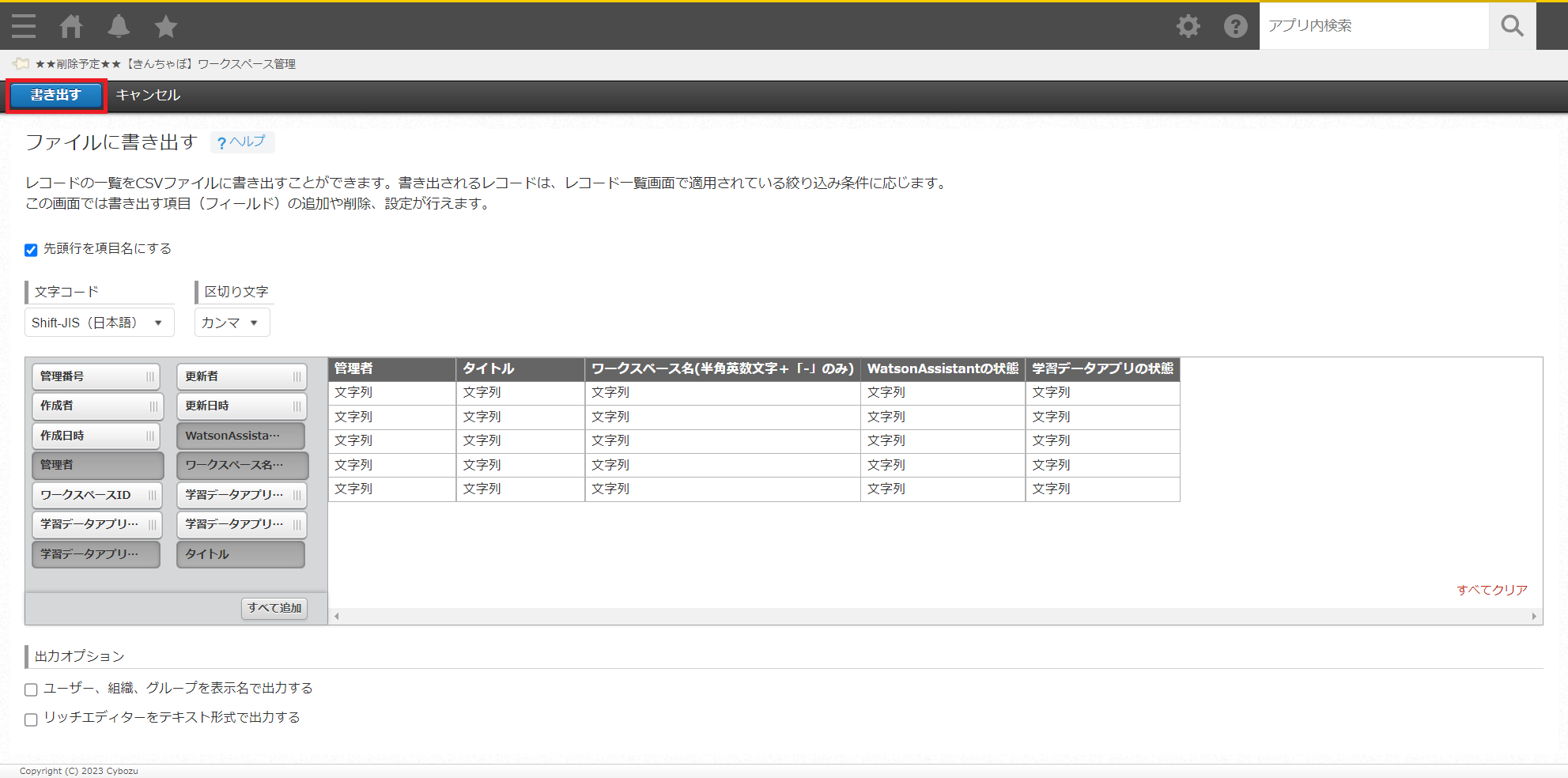 バージョンアップを行う対象のアプリを開きます。次に「ファイルに書き出す」を選択し、レコード番号(項目名が管理番号、チャットIDも有)、作成者、作成日時、更新者、更新日時項目以外を書き出し項目とし、バックアップを行います。