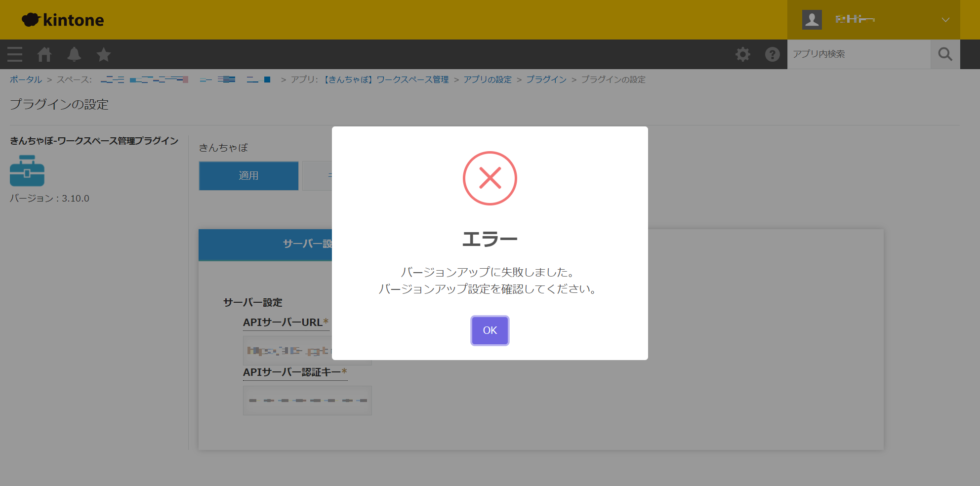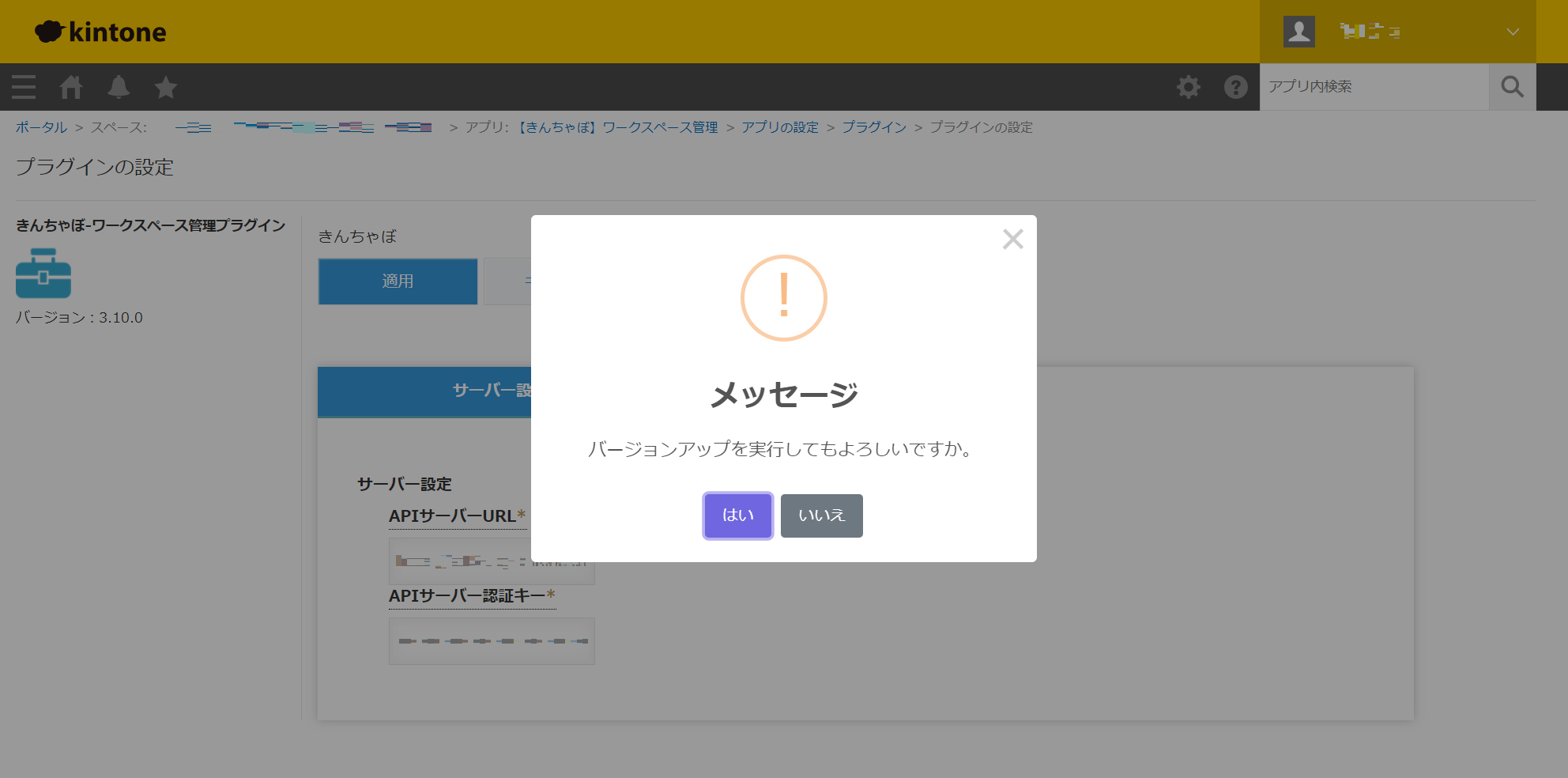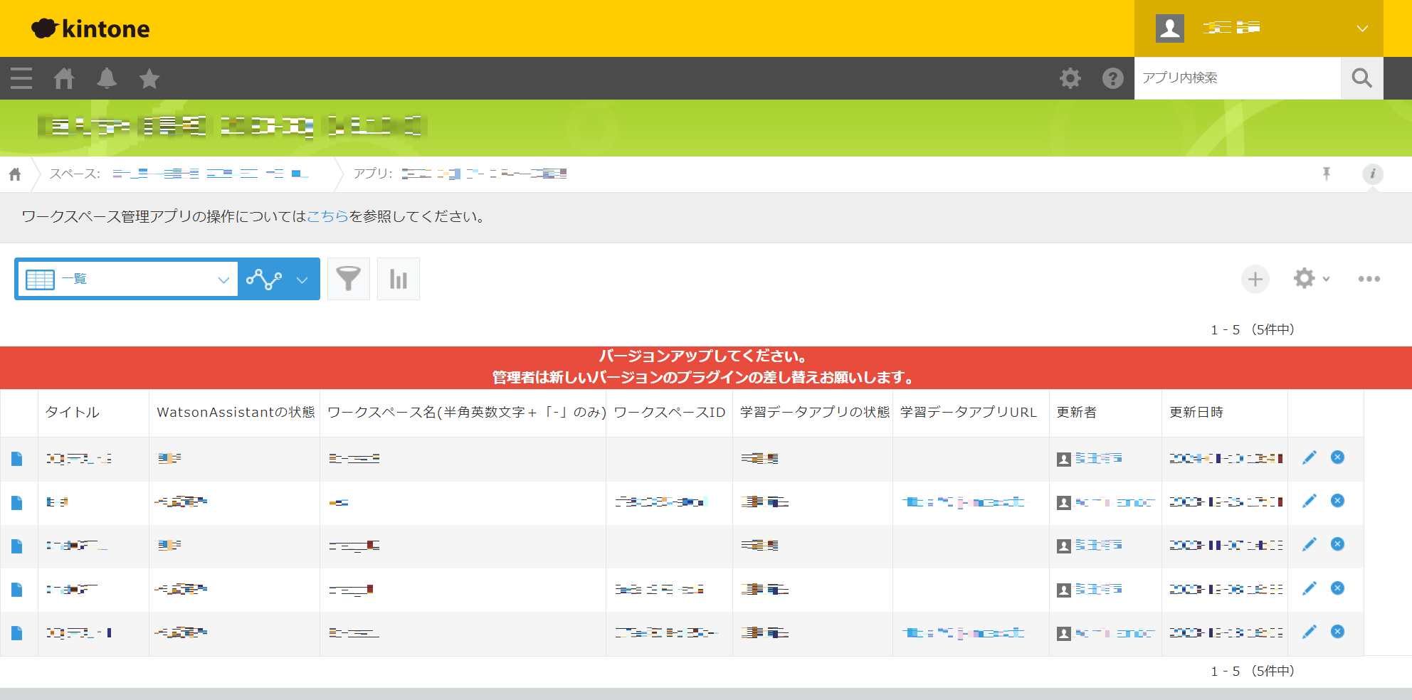 プラグインバージョンが古い場合、プラグインバージョンアップのメッセージがプラグイン画面、レコード一覧画面に表示されます。