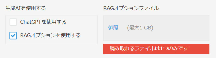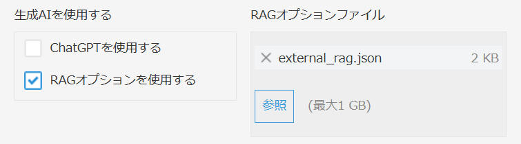 ※RAGの依頼をしていただくとRAGオプション用のファイルが送られるので、送られたファイルをこの画面のRAGオプションファイルに指定します。読み込めるファイルは1つのみですのでご注意ください。