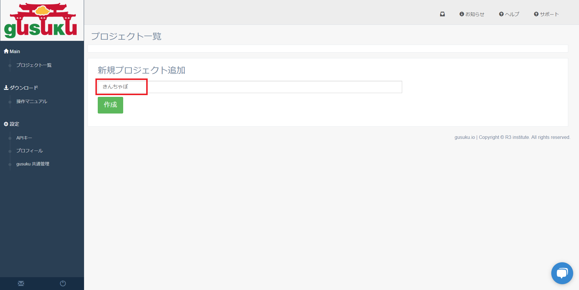 新規プロジェクト名に「きんちゃぼ」と入力し、作成をクリックします。