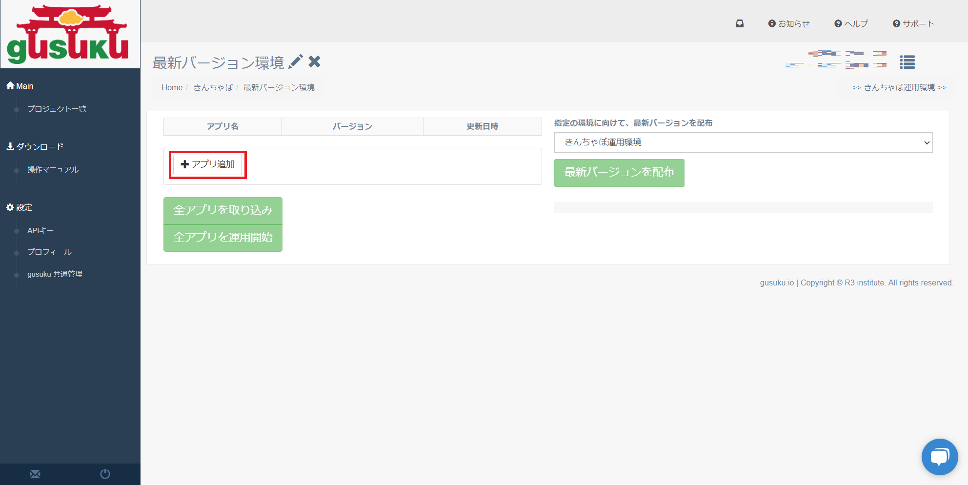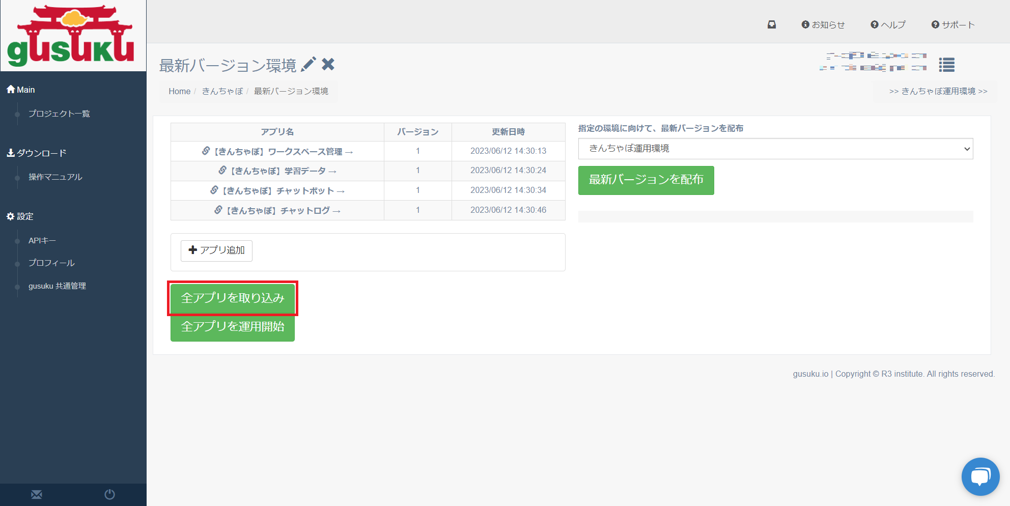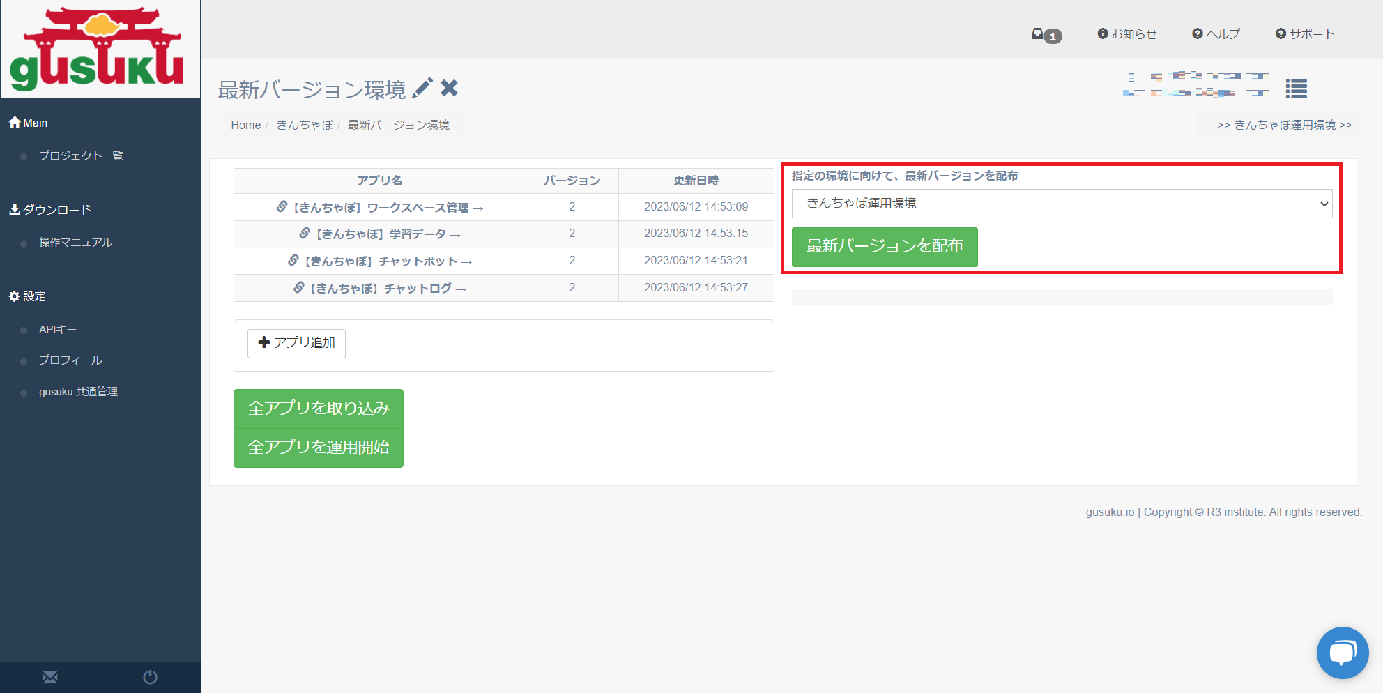 「きんちゃぼ運用環境」のアプリのバージョンが1つ上がると、最新バージョンのアプリの配布が完了します。