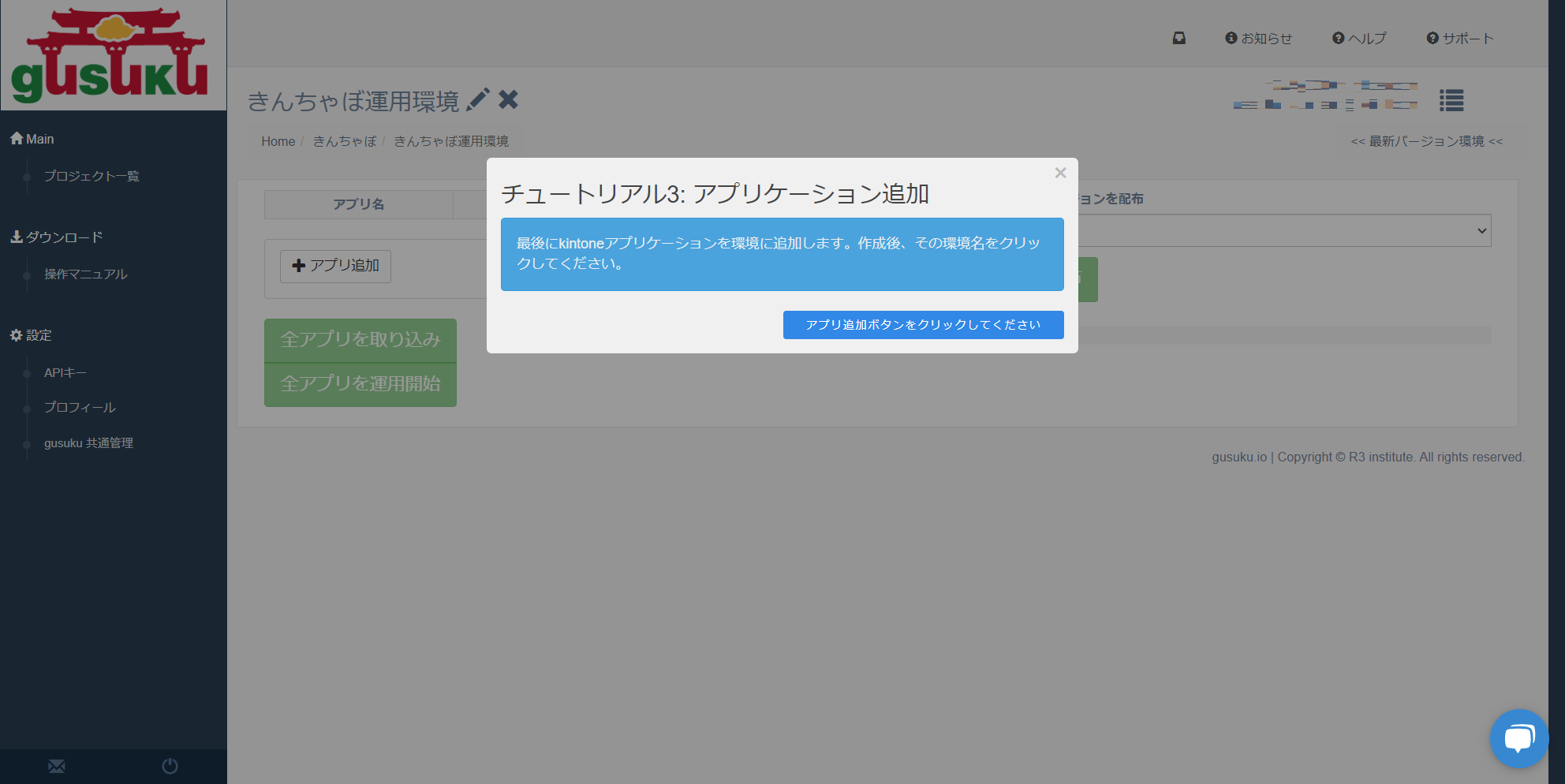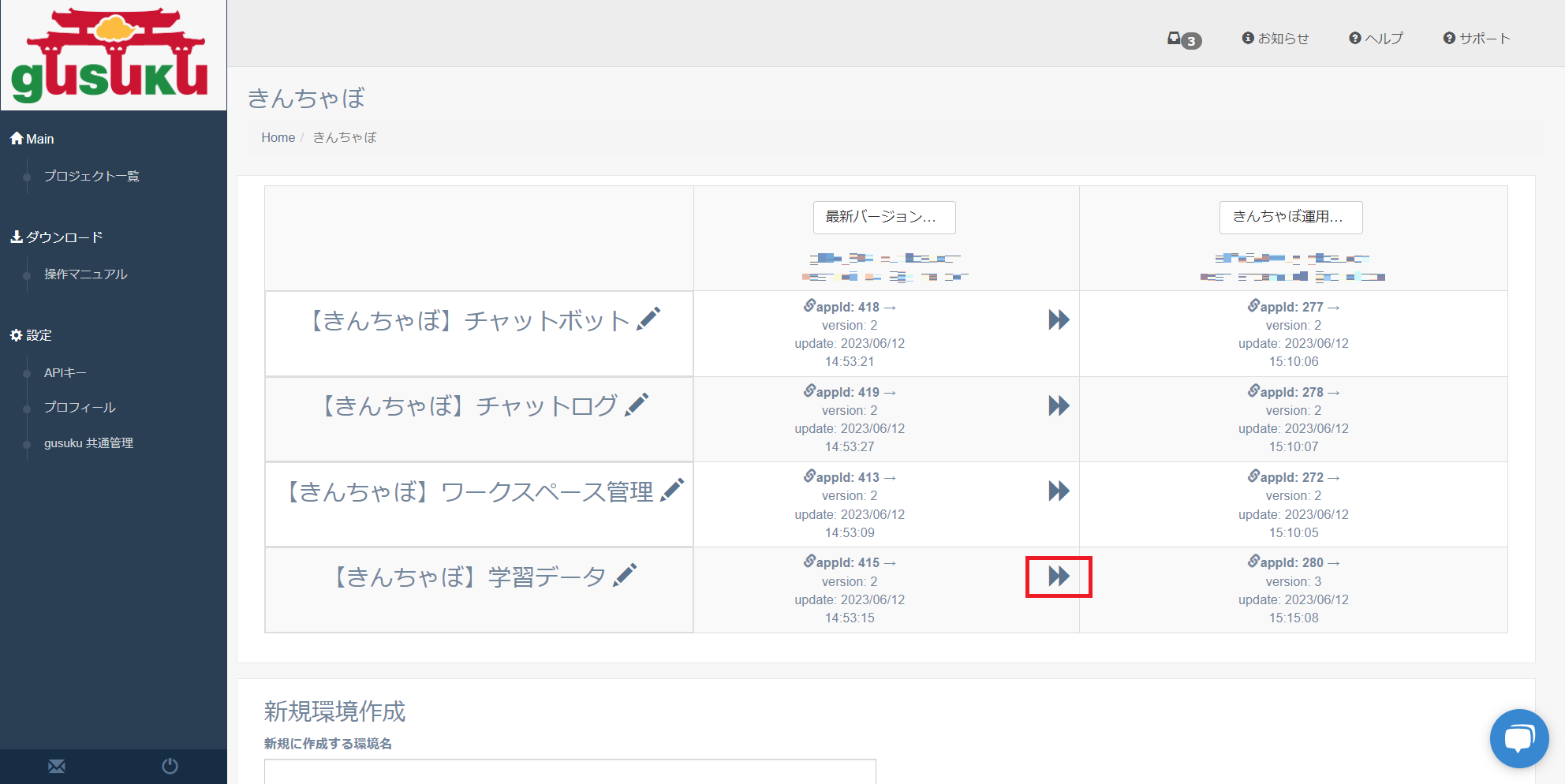 「最新バージョン環境」のアプリと「きんちゃぼ運用環境」のアプリを紐づけます。