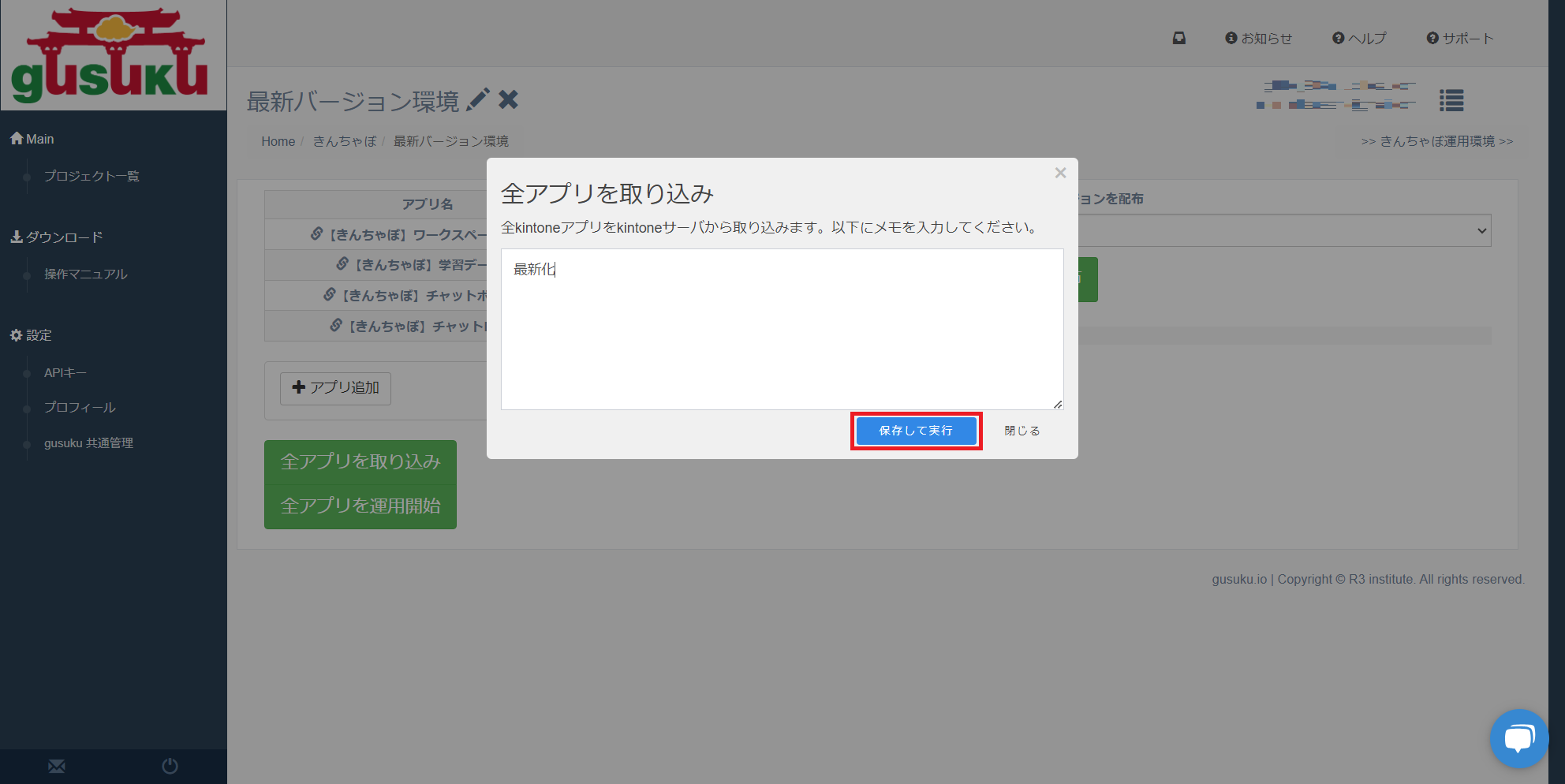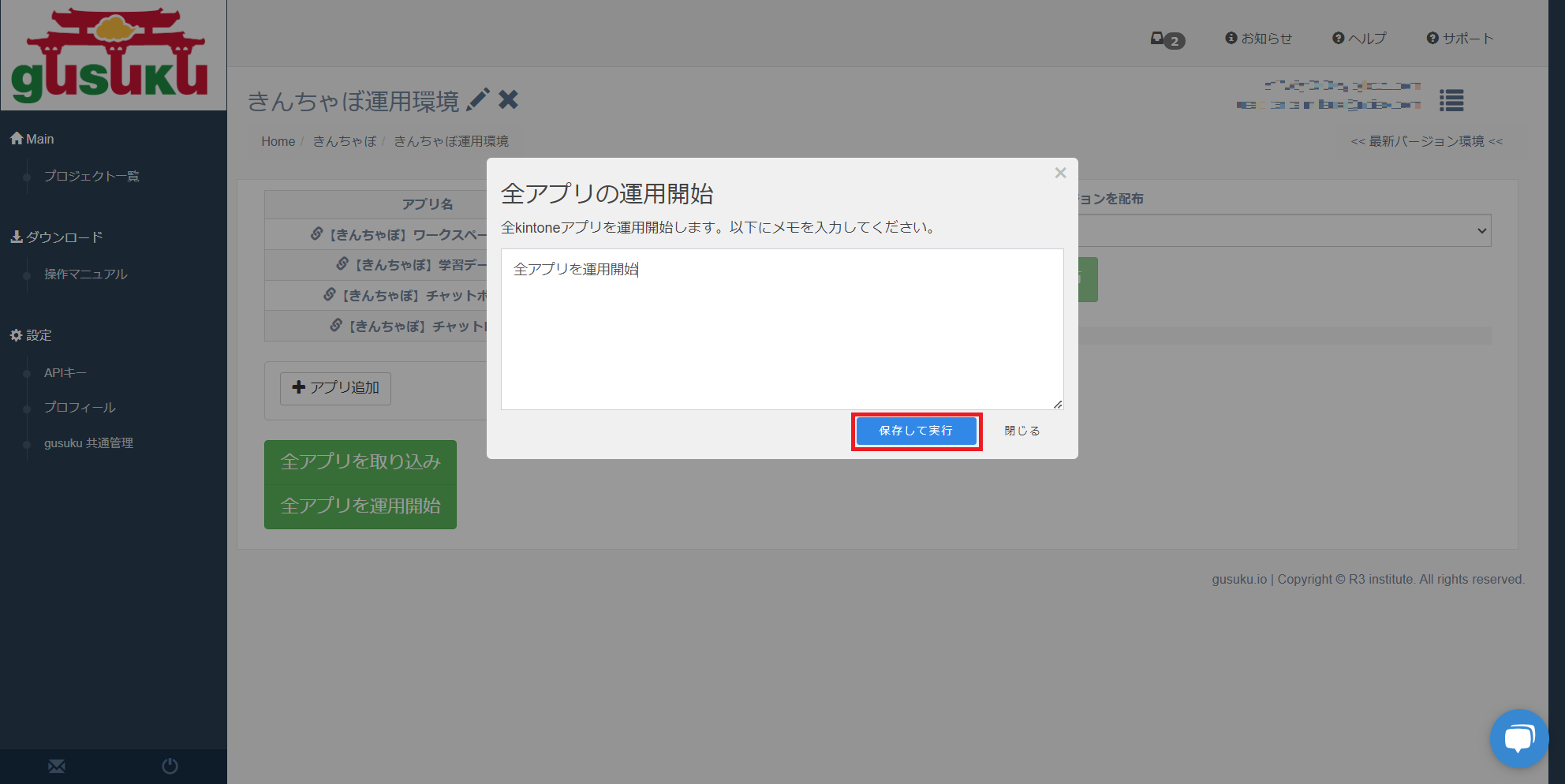 メモに「全アプリを運用開始」を入力し、保存して実行します。