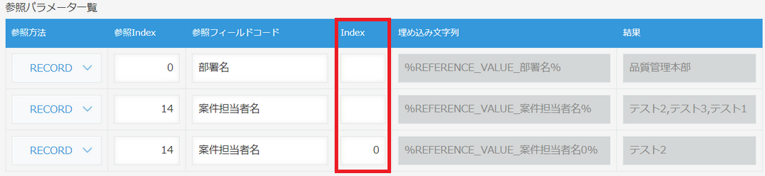 担当者など、複数の値を格納できるフィールドである場合に何番目のデータから値を取得するのか指定(Index)できるようになりました。