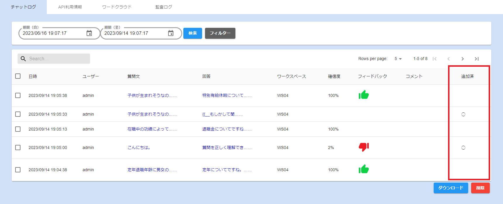 No.2 ログ一覧画面に質問をワークスペースへ追加済みであることを示す「追加済」列を追加しました。