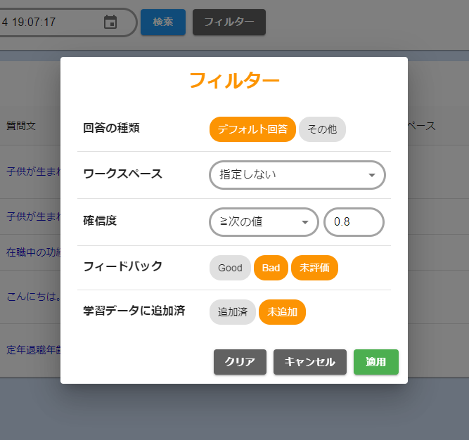 - 学習データ・回答データ・同義語辞書をCSV出力する際に、途中に空行または空の項目があった場合は無視されてデータとして出力されないようになりました。