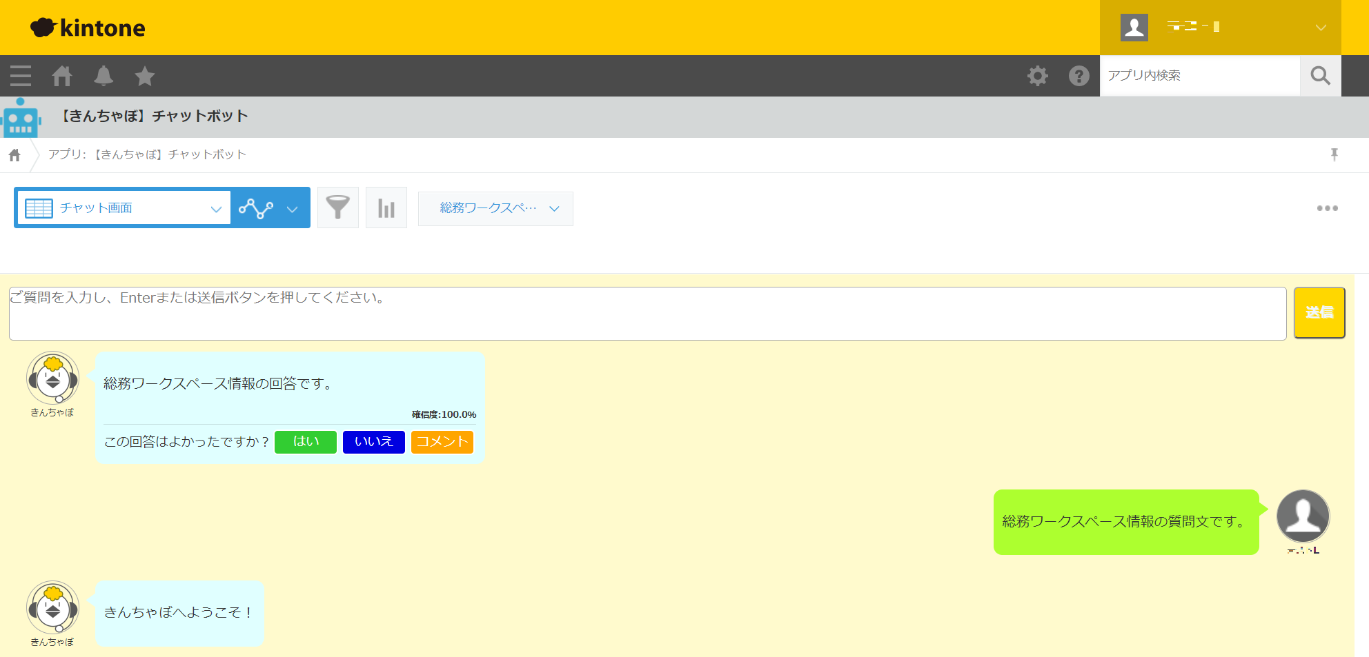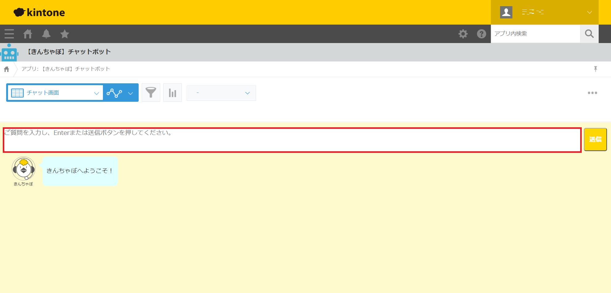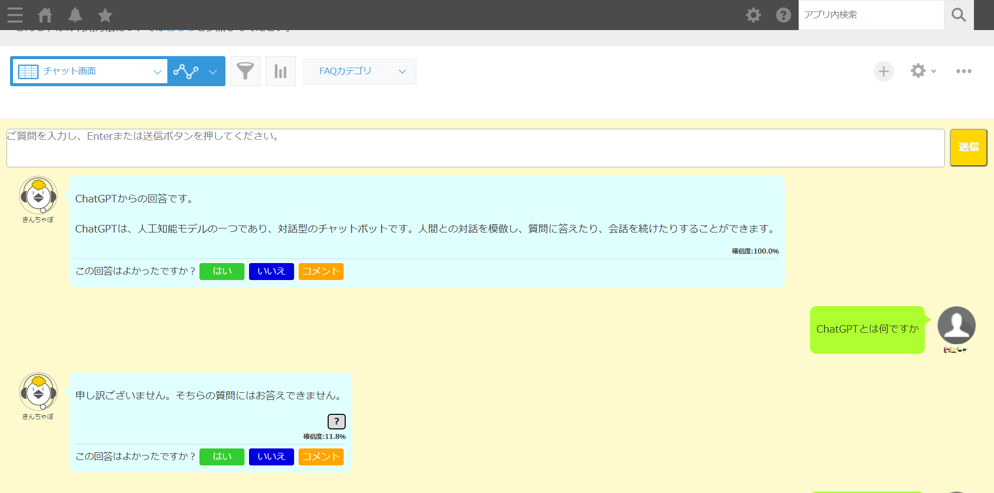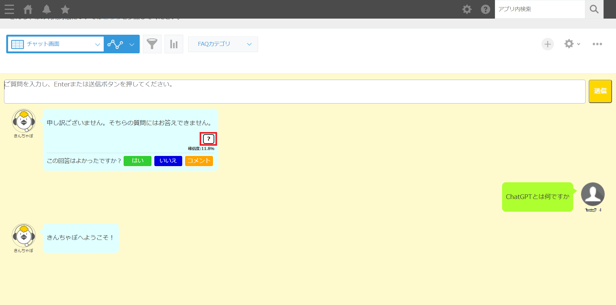 - 質問を入力し、送信をクリックすることできんちゃぼに質問することができます。