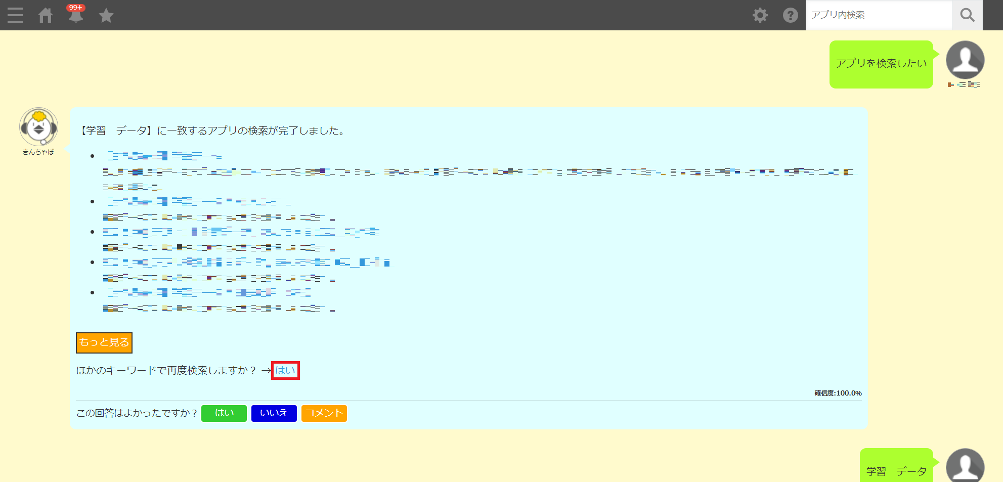 - 「ほかのキーワードで再度検索しますか?」の隣にある「はい」をクリックすることで、ほかのキーワードでアプリの再検索が可能です。